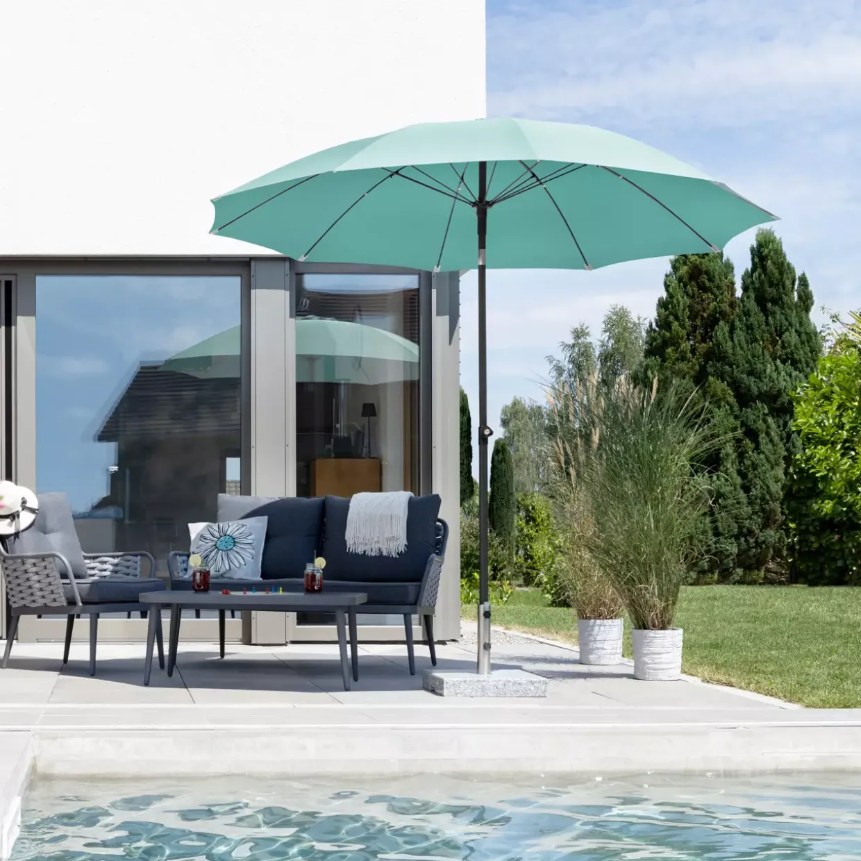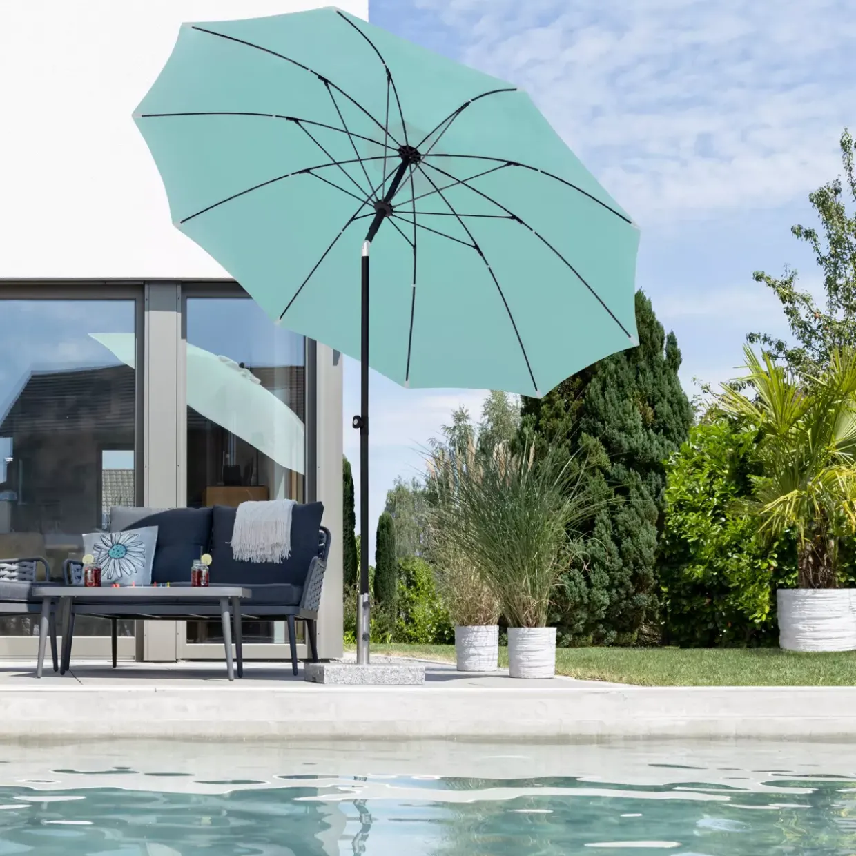 Eleganz in mintgrünem Design trifft auf Funktionalität in der Tarifa-Serie. Der moderne Stil dieses Sonnenschirms wird durch die Kombination aus hochwertigem Stoff und robustem Metall perfekt ergänzt. Die innovative Konstruktion mit einem zweiteiligen Stock von 34/38 mm Durchmesser sorgt für Stabilität und Langlebigkeit.