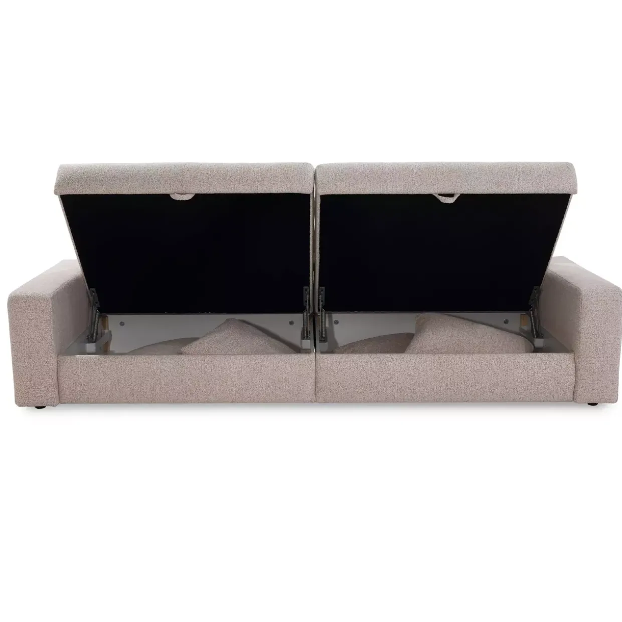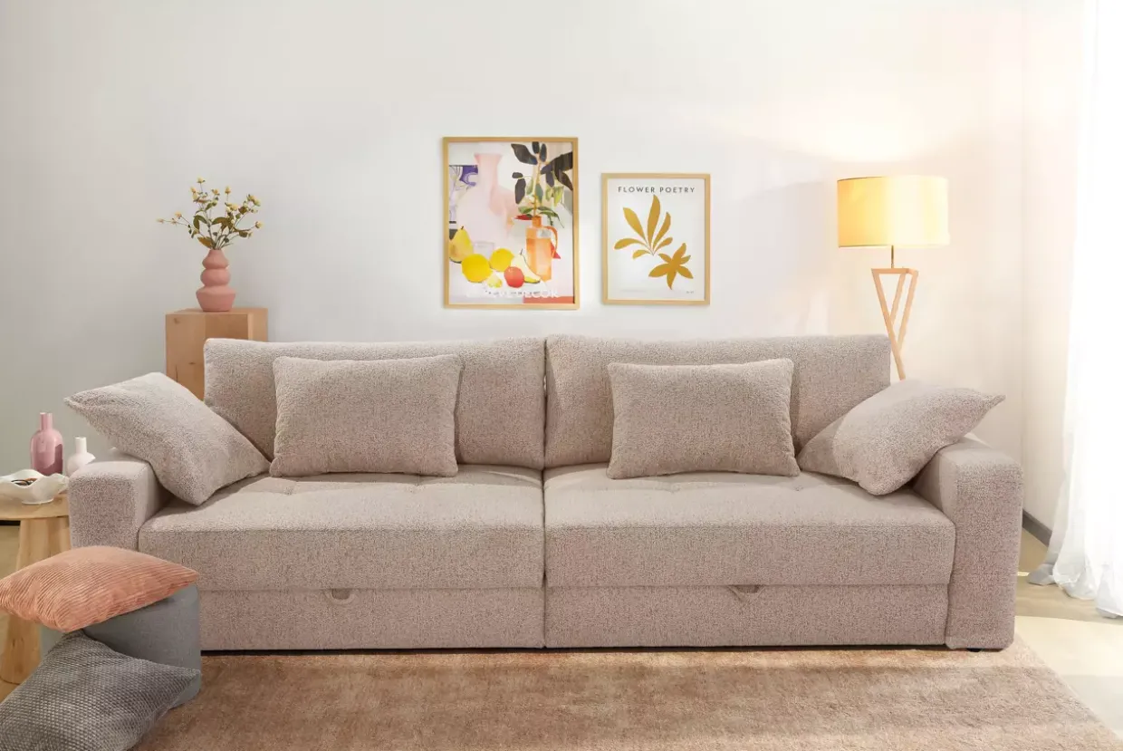 Zwei großzügige Bettkästen bieten praktischen Stauraum, ideal für Bettwäsche oder andere Utensilien. Die Polsterung, bestehend aus Nosagunterfederung und Schaumstofffüllung, gewährleistet hohen Sitzkomfort und lädt zum Entspannen ein. Ein weiteres Highlight sind die mitgelieferten Kissen: zwei große, zwei mittlere Rückenkissen sowie zwei flauschige Fluppykissen sorgen für zusätzlichen Komfort und eine einladende Optik.