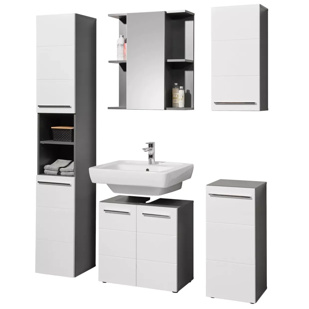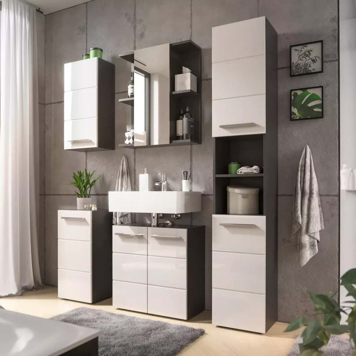 Eine Spiegeltüre eröffnet Ihnen neue Möglichkeiten der Raumgestaltung. Der Gloss Spiegelschrank beeindruckt durch sein modernes Design und fügt sich nahtlos in zeitgemäße Wohnkonzepte ein. Mit seiner eleganten Farbgebung in Anthrazit, Weiß Hochglanz und Silber setzt er stilvolle Akzente und verleiht Ihrem Badezimmer eine besondere Note.