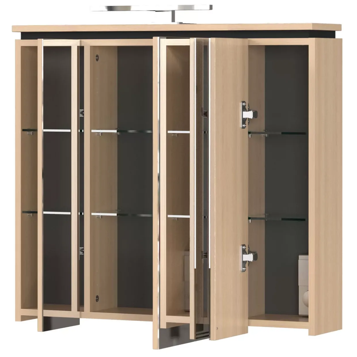 Ein weiteres Highlight ist der 3-D-Spiegel, der nicht nur funktional, sondern auch optisch überzeugt. Verstellbare Einlegeböden aus stabilem Glas ermöglichen eine flexible Gestaltung des Innenraums, sodass all Ihre Pflegeprodukte ihren Platz finden. Die Kombination aus Holzwerkstoff, Metall und Glas verleiht dem Spiegelschrank eine edle und gleichzeitig robuste Ausstrahlung.