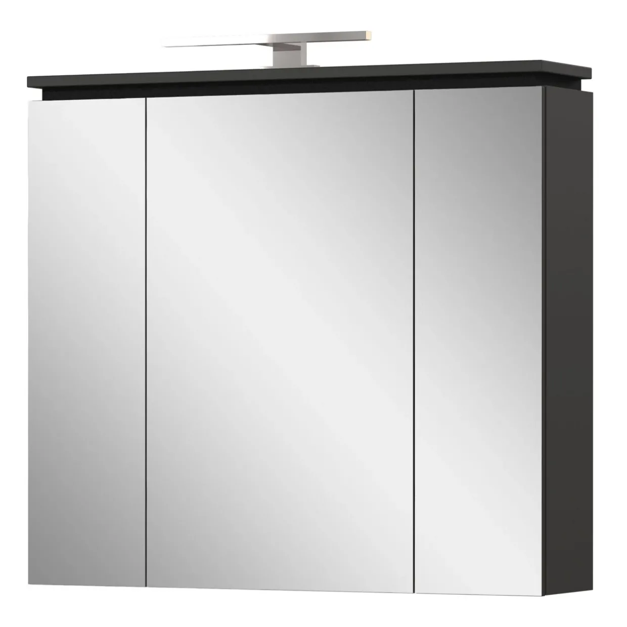Die integrierte LED-Beleuchtung des Modesto Spiegelschranks sorgt für eine stimmungsvolle Atmosphäre im Badezimmer und erleichtert die tägliche Pflege. Modern und funktional präsentiert sich dieser hochwertige Spiegelschrank, der durch seine anthrazitfarbenen und graphitfarbenen Akzente sowie verspiegelte Türen ein elegantes Ambiente schafft. Aus robustem Holzwerkstoff und Spiegelglas gefertigt, bietet er kratzfeste und widerstandsfähige Oberflächen, die den Herausforderungen des Alltags standhalten.