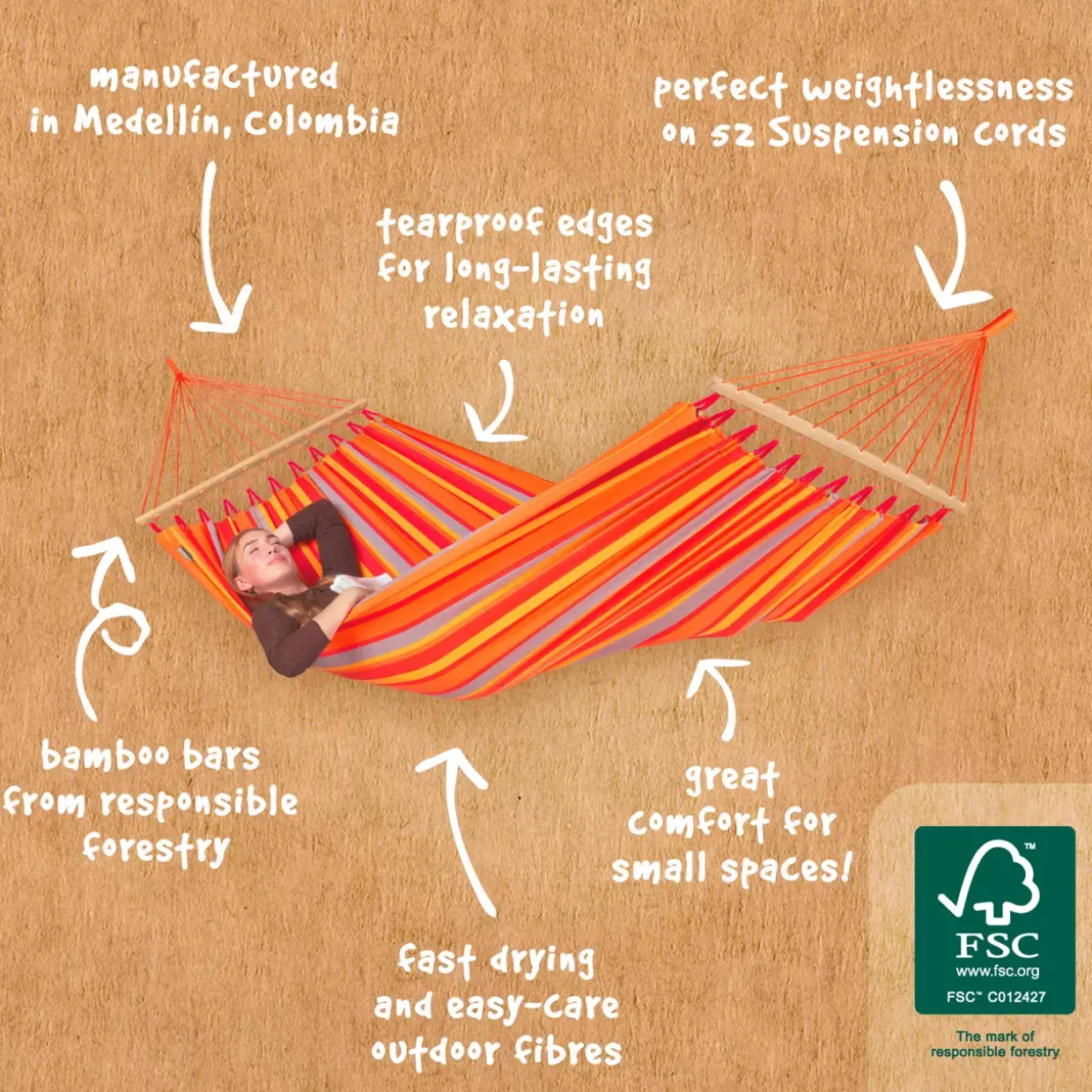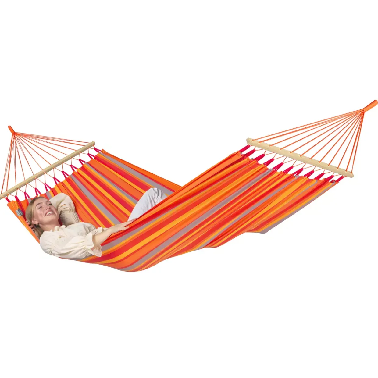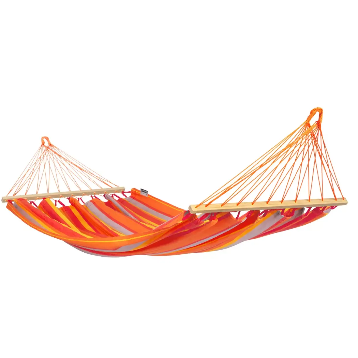 Ein modernes Design, ein angenehmes Material und eine ansprechende Farbe machen diese Hängematte zu einem idealen Begleiter für ruhige Stunden im Freien. Nutzen Sie die Gelegenheit, sich in die Alisio Stabhängematte zu legen und den Alltag hinter sich zu lassen.