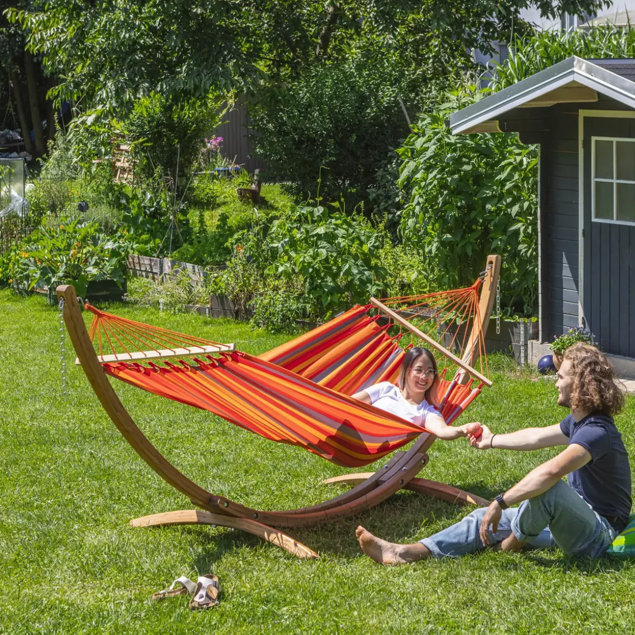 Das Modell Alisio überzeugt durch sein modernes Design, das sich mühelos in verschiedene Einrichtungsstile integrieren lässt. Die klare Linienführung und die harmonische Farbgebung machen die Hängematte zu einem echten Hingucker. Ob im Schatten eines Baumes oder unter einem Sonnenschirm, sie schafft einen Rückzugsort der besonderen Art.