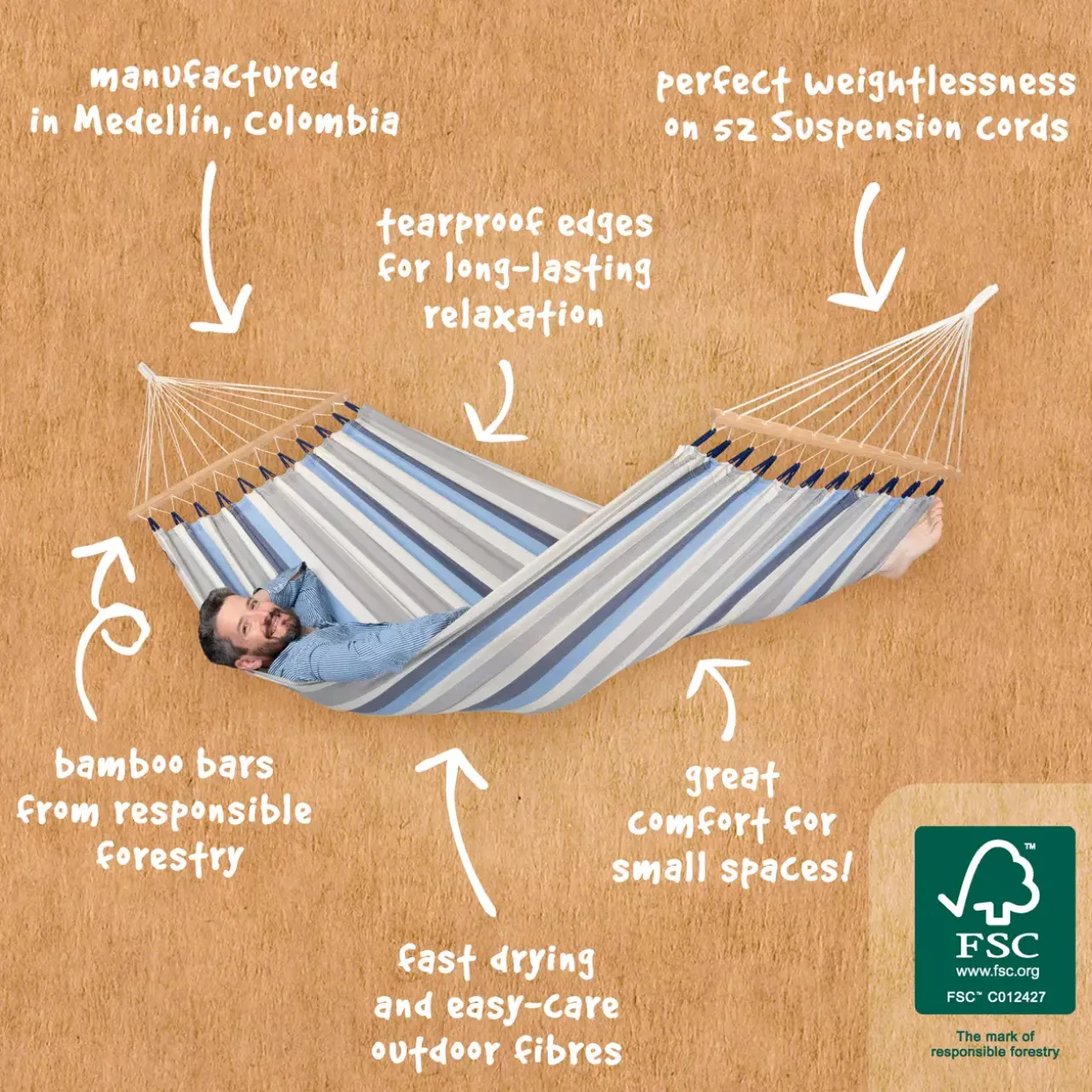 Die Hängematte ist durch ihre durchdachte Materialwahl besonders für den Außenbereich geeignet. Polypropylen als Textilart bietet dabei Schutz vor Witterungseinflüssen und garantiert eine lange Lebensdauer der Hängematte. Ob im Garten, auf der Terrasse oder im Wintergarten – die Alisio Stabhängematte wird zum stilvollen Rückzugsort.