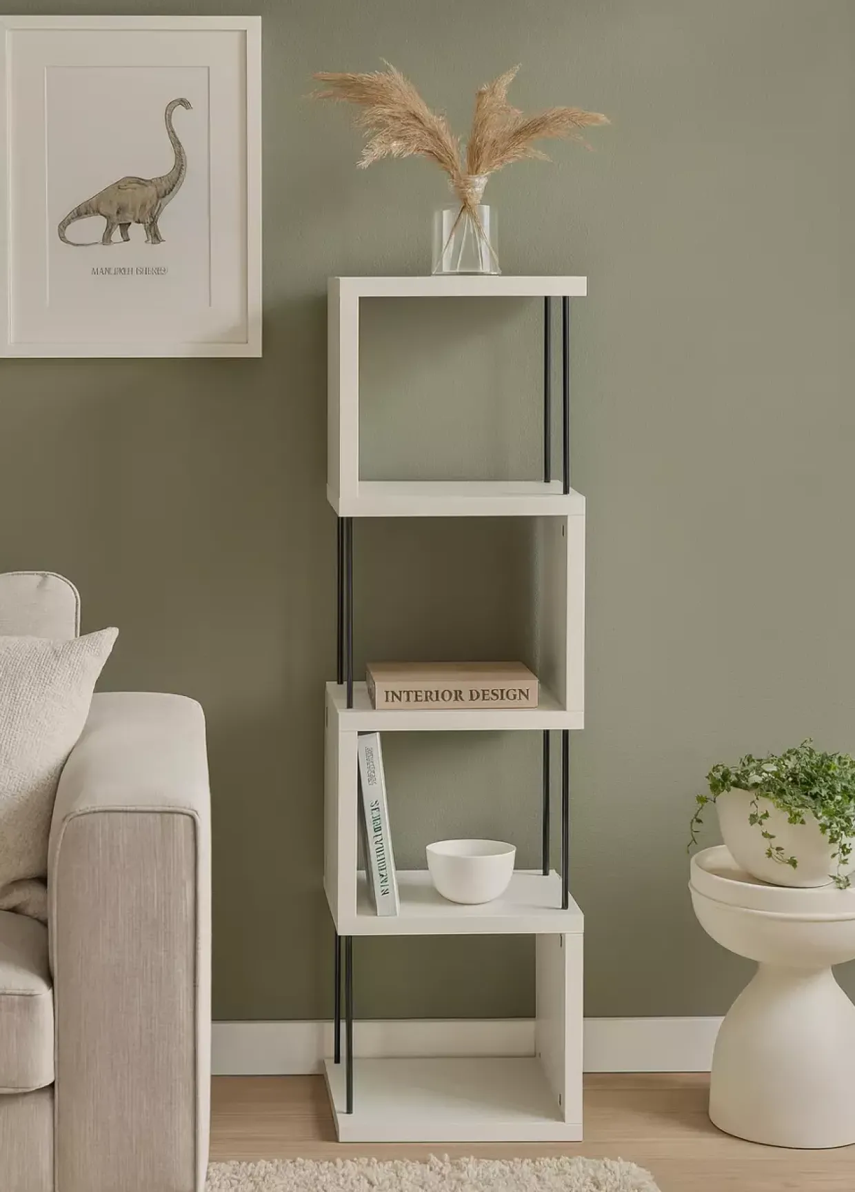 Eleganz in modernem Design: Ein Standregal, das mit seinem zeitlosen Stil und der Kombination aus einem weißen, matt lackierten Finish und schwarzen Stäben überzeugt. Diese ästhetische Kreation bietet nicht nur Platz, sondern auch eine stilvolle Aufwertung für jedes Interieur. Mit vier großzügigen Ablagefächern bietet es ausreichend Raum für Bücher, Dekorationen oder andere Sammlerstücke, die Sie gerne präsentieren möchten.Gefertigt aus einer harmonischen Mischung von Holzwerkstoff, Kunststoff und Metall, verspricht das Regal nicht nur Stabilität, sondern auch Langlebigkeit. Die lackierte und melaminharzbeschichtete Oberfläche sorgt für eine pflegeleichte Handhabung. Ein einfaches feuchtes Abwischen genügt, um die makellose Optik zu bewahren.Das Regal fügt sich nahtlos in jede Jahreszeit ein und bewahrt stets seinen modernen Charme. Die Gleiter-Fußform bietet Stabilität auf verschiedensten Untergründen und ermöglicht eine flexible Platzierung in jedem Raum. Zertifikate wie ISO 9001 und Made in Germany sprechen für die Qualität und die sorgfältige Verarbeitung des Produkts. Eine Investition, die nicht nur durch Funktionalität, sondern auch durch Design und Qualität überzeugt. Ein Möbelstück, das in jedem Zuhause seinen Platz findet und beständige Freude bietet.