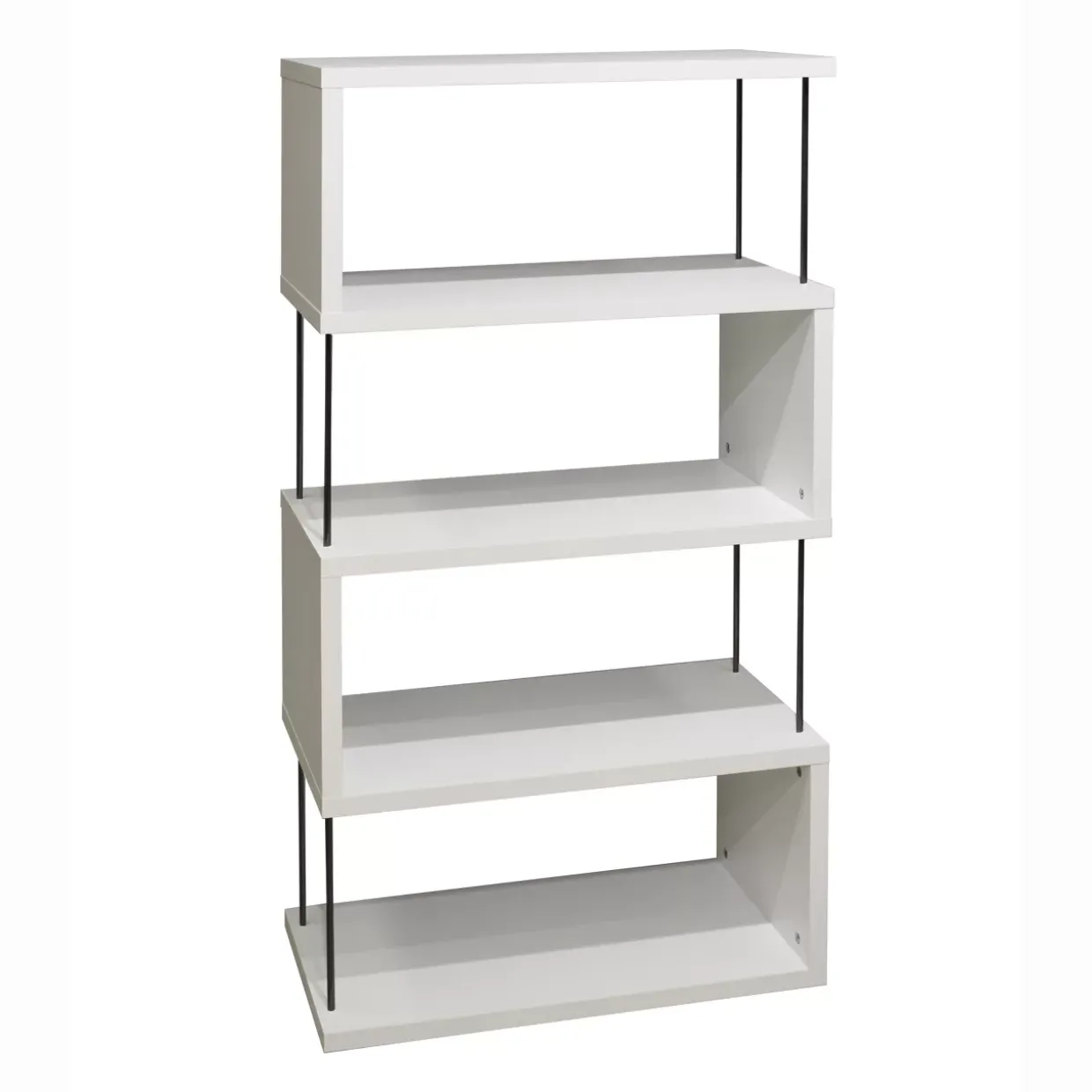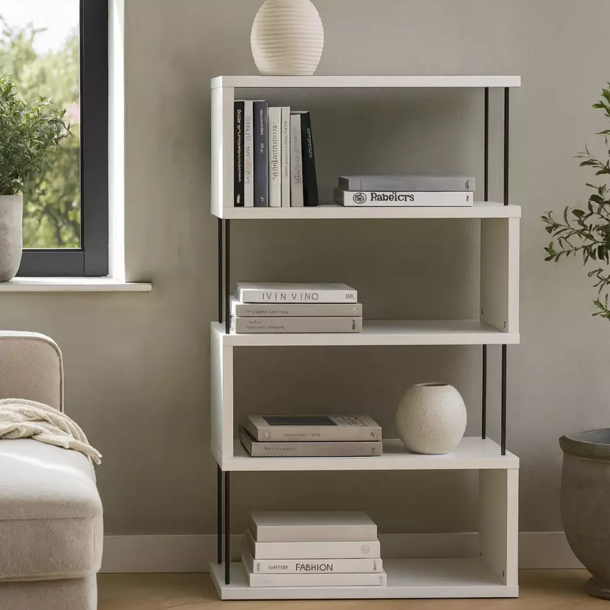 Zeitlose Eleganz trifft auf moderne Funktionalität. Dieses Standregal vereint gekonnt eine weiße, matt lackierte Oberfläche mit schwarzen Stäben und bietet so einen stilvollen Akzent in jedem Raum. Vier großzügige Ablagefächer bieten ausreichend Platz für Bücher, Dekoration oder Alltagsgegenstände und ermöglichen eine flexible Nutzung das ganze Jahr über. Die Kombination aus Holzwerkstoff, Kunststoff und Metall sorgt nicht nur für Stabilität, sondern auch für eine ansprechende Optik, die sich harmonisch in moderne Wohnkonzepte einfügt. Die lackierte und melaminharzbeschichtete Oberfläche gewährleistet dabei eine hohe Strapazierfähigkeit und ist besonders pflegeleicht. Ein einfaches feuchtes Tuch genügt, um die Oberfläche schnell und mühelos zu reinigen.Dank der Gleiter-Fußform lässt sich das Regal problemlos verschieben und bietet somit Flexibilität bei der Raumgestaltung. Qualität wird großgeschrieben: Mit den Zertifikaten ISO 9001 und Made in Germany stehen höchste Standards in der Produktion im Vordergrund. Diese Auszeichnungen unterstreichen die Langlebigkeit und Zuverlässigkeit des Produkts.Ein Standregal, das nicht nur durch seine Funktionalität überzeugt, sondern auch durch sein klares Design und seine hochwertige Verarbeitung. Ideal für alle, die Wert auf Qualität und Ästhetik legen.