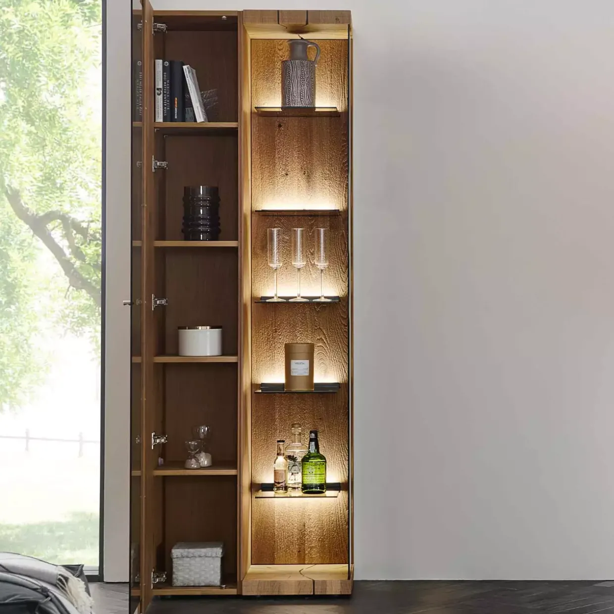 Die natürliche Schönheit der Eiche trifft auf die moderne Eleganz einer Standvitrine. Dieses exquisite Möbelstück vereint die warme Ausstrahlung von Riffholz mit der beeindruckenden Textur von massiv sägerau gebürsteter Kerneiche Umato. Durch die Holz- und Glastür, verziert mit einer stilvollen Applikation aus anthrazitfarbenem Metall, fügt sich die Vitrine harmonisch in jedes zeitgemäße Interieur ein.Eine gekonnte Kombination aus Holz, Metall und Glas verleiht diesem Möbelstück nicht nur eine ästhetische Vielfalt, sondern auch eine bemerkenswerte Stabilität und Langlebigkeit. Der moderne Stil dieser Vitrine wird durch die klaren Linien und das raffinierte Design unterstrichen, während die natürliche Maserung der Eiche eine warme und einladende Atmosphäre schafft.Interessieren Sie sich für eine besondere Beleuchtung? Auf Anfrage kann eine passende Beleuchtung integriert werden, die das Innere der Vitrine in ein sanftes Licht taucht und Ihre Lieblingsstücke gekonnt in Szene setzt. Diese Option bietet eine zusätzliche Möglichkeit, dem Raum eine individuelle Note zu verleihen und die Vitrine zum strahlenden Mittelpunkt Ihres Zuhauses zu machen.