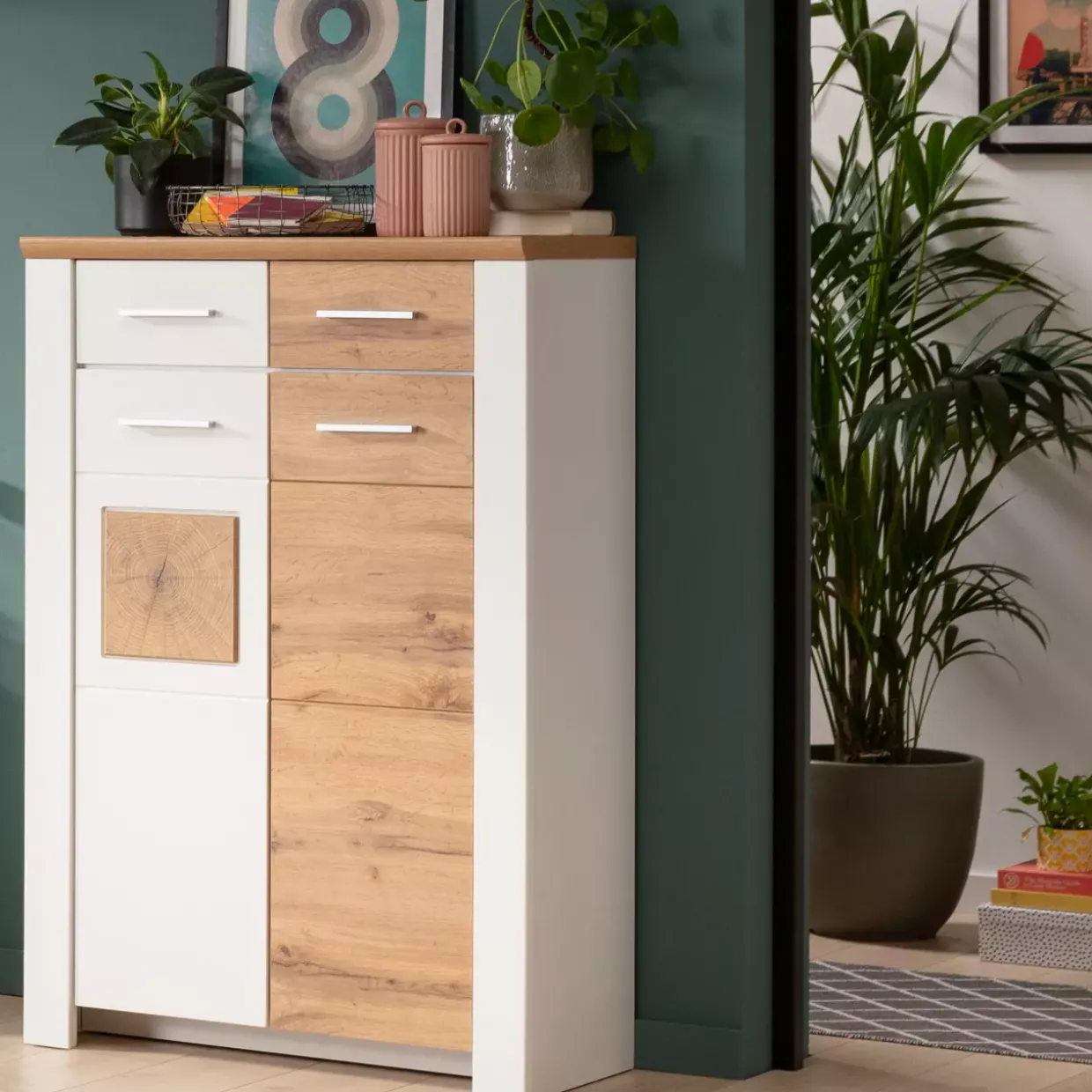 Die Farbpalette, bestehend aus weiß matt, ergänzt durch Deckel in Eiche Altholz Nachbildung, bringt eine angenehme Wärme in Ihr Zuhause. Silberne Mattakzente runden das Design stilvoll ab. Dieser Schrank ist nicht nur funktional, sondern auch ein ästhetisches Element in jedem Raum.