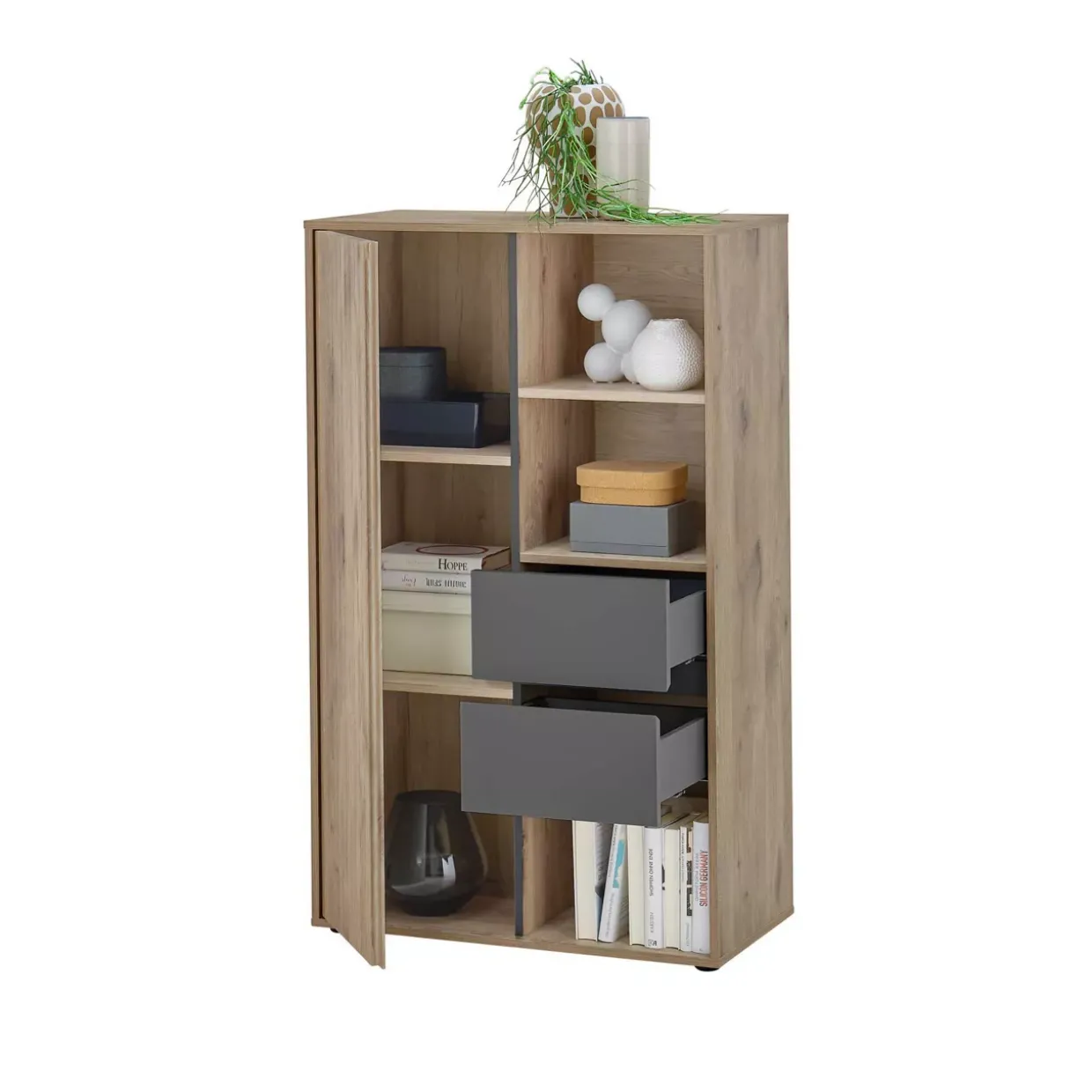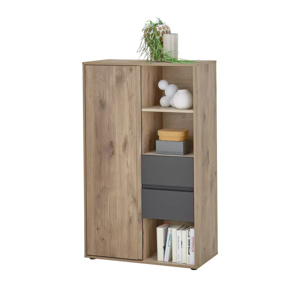 NOVARA Staur.elem. 1T 2SK Vik.Oak/Vik.Oak Abs.Grau BHT ca. 76x125x38 cmElegant und zeitgemäß präsentiert sich das Novara Highboard. Mit seiner modernen Optik fügt es sich nahtlos in jede stilvolle Einrichtung ein. Die Farbvarianten in Viking Oak, braun, grau und schwarz bieten eine vielseitige Auswahl, die sich harmonisch in Ihre Wohnlandschaft einfügt.Gefertigt aus einer Kombination von Holzwerkstoff und Kunststoff, überzeugt das Highboard durch seine Langlebigkeit und Stabilität. Das Soft-Close-System sorgt für ein geräuschloses Schließen der Türen und Schubladen, was nicht nur Komfort, sondern auch eine verlängerte Lebensdauer der Möbel garantiert.Die Pflege dieses hochwertigen Möbelstücks gestaltet sich unkompliziert: Ein einfaches trockenes Abwischen genügt, um die Oberfläche sauber und ansprechend zu halten. Damit bleibt das Novara Highboard auch nach Jahren ein stilvoller Hingucker.Ob im Wohn-, Ess- oder Arbeitszimmer, dieses Highboard bietet nicht nur Stauraum, sondern auch eine Bühne für Dekorationen oder Kunstobjekte. Seine klaren Linien und die sorgfältige Verarbeitung machen es zu einem unverzichtbaren Bestandteil moderner Inneneinrichtung. Lassen Sie sich von der Kombination aus Funktionalität und Ästhetik überzeugen und schaffen Sie eine warme, einladende Atmosphäre in Ihrem Zuhause.