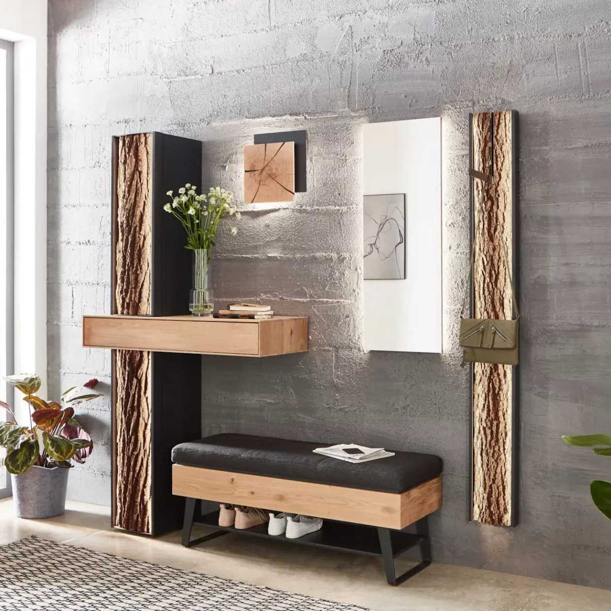 Besonders hervorzuheben ist die Rindenapplikation, die dem Möbelstück eine einzigartige Note verleiht. Diese subtile Verbindung von Natur und Design macht das Runa-G Stauraumelement zu einem wahren Blickfang.