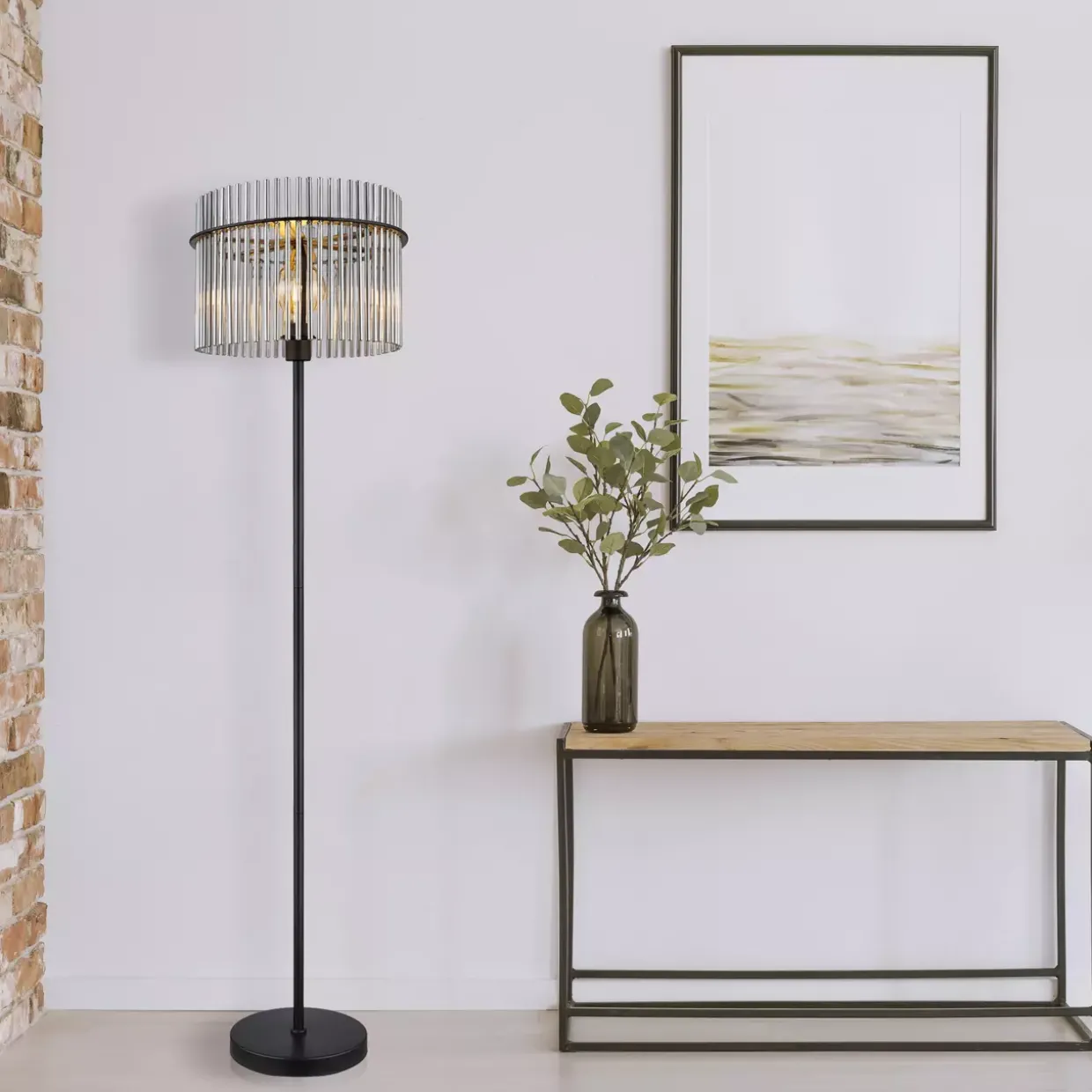 Die Stehleuchte „Gorley“ besticht durch ihr modernes und zugleich elegantes Design, das sich nahtlos in verschiedene Einrichtungsstile einfügt. Hergestellt aus hochwertigem Metall in einem stilvollen mattschwarzen Finish, verleiht sie Ihrem Raum eine edle und zeitgemäße Note. Mit einer beeindruckenden Größe von 38 x 152 Zentimetern eignet sich diese Leuchte perfekt als dekoratives und funktionales Beleuchtungselement in Ihrem Wohnzimmer, Schlafzimmer oder Büro. Ein besonderes Highlight der Stehleuchte „Gorley“ ist ihr einzigartiger Lampenschirm, der aus grauen Rauchglasstäben besteht. Dieses raffinierte Design erzeugt ein faszinierendes Licht- und Schattenspiel, das eine angenehme und gemütliche Atmosphäre schafft. Die grauen Rauchglasstäbe brechen das Licht auf elegante Weise und sorgen für eine gleichmäßige und sanfte Beleuchtung. Die Leuchte ist für Leuchtmittel des Typs E27 geeignet und kann mit einer maximalen Leistung von bis zu 60 Watt betrieben werden.