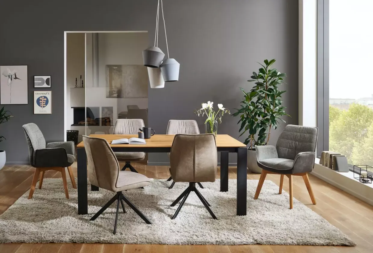 Ein Highlight des Gent Modells ist die 180° Drehfunktion mit praktischer Rückholfunktion, die Flexibilität und Bequemlichkeit in jede Alltagssituation bringt. Der Echtbezug des Rückens gewährleistet nicht nur eine ansprechende Optik, sondern auch Langlebigkeit und Pflegeleichtigkeit. Die Kombination aus Stoff und Metall verleiht dem Stuhl eine moderne Ästhetik, die sich nahtlos in verschiedenste Einrichtungsstile einfügt.