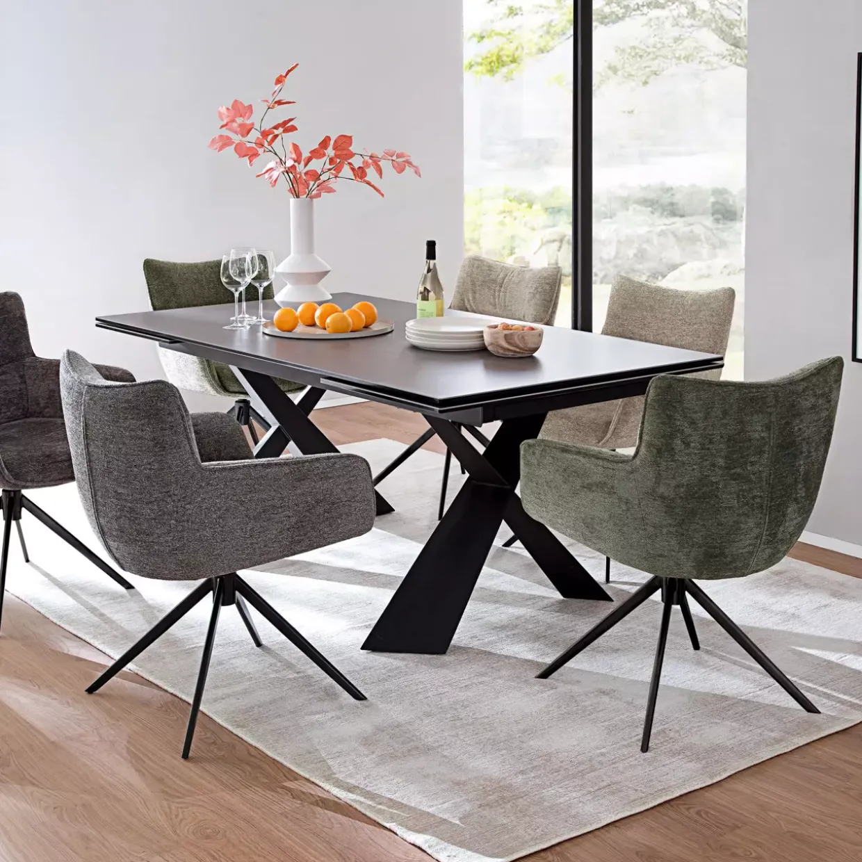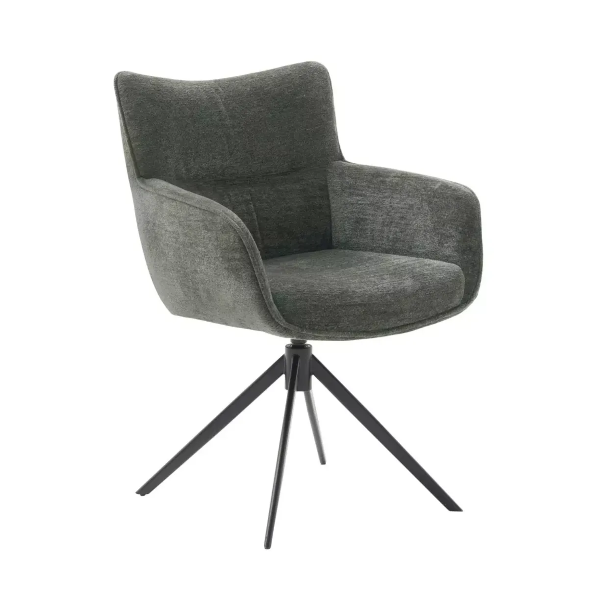 LIMONE 1 4 Fuß Stuhl Exklusiv BEGROSEin luxuriöser Taschenfederkern-Luxuskomfortsitz bildet das Herzstück dieses modernen Stuhls. Geschaffen für den stilbewussten Genießer, verbindet er Funktionalität und Ästhetik auf beeindruckende Weise. Das 4-Fußgestell aus robustem Metall trägt zu einer stabilen Basis bei, während der lackierte Webstoff mit seiner Struktur für eine edle Optik sorgt. In der Kombination aus Schaumstofffüllung und Taschenfederkern zeigt sich ein Sitzaufbau, der höchsten Komfort verspricht. Der Bezug aus Polyester in einem eleganten Webstoff fügt sich harmonisch in moderne Wohnkonzepte ein. Eine 360°-Drehfunktion mit Nivellierung ermöglicht Flexibilität und Anpassungsfähigkeit, die im Alltag von Vorteil sind.Olive und schwarz matt als Farbgebung verleihen dem Stuhl eine zeitlose Eleganz, die sich mühelos in verschiedene Interieurs integrieren lässt. Die Textur des Strukturgewebe-Stoffes bietet nicht nur Haptik, sondern auch visuelle Tiefe, die den Stuhl zu einem Blickfang in jedem Raum macht.Der Stuhl ist mehr als nur ein Möbelstück; er ist eine Einladung, Platz zu nehmen und zu verweilen. Der Einsatz hochwertiger Materialien garantiert Langlebigkeit und Beständigkeit, sodass dieser Stuhl sowohl in stilistischer als auch in funktionaler Hinsicht überzeugt. Ein harmonisches Zusammenspiel aus Design und Komfort, das den Alltag verschönert.