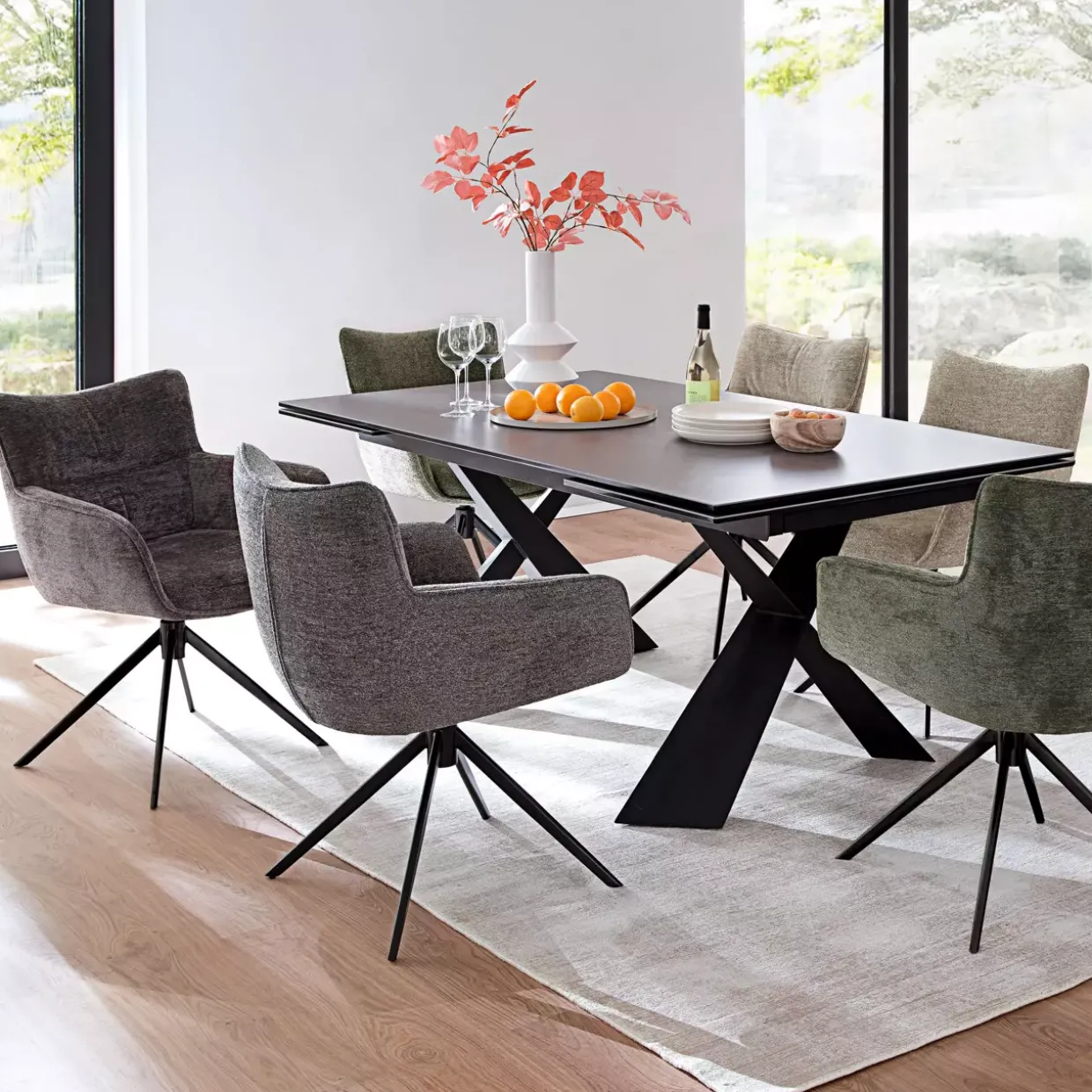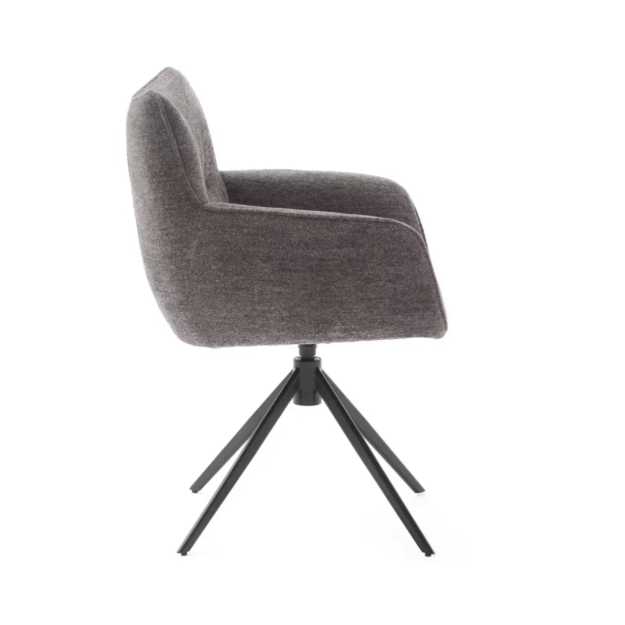 LIMONE 1 4 Fuß Stuhl Exklusiv BEGROSEin luxuriöser Sitzkomfort, der seinesgleichen sucht: Der Taschenfederkern-Luxuskomfortsitz bietet optimalen Halt und höchste Bequemlichkeit. Der moderne Stil des Stuhls fügt sich nahtlos in zeitgenössische Interieurs ein und setzt stilvolle Akzente. Dank des strapazierfähigen Strukturgewebe-Stoffs in anthrazit und schwarz matt, kombiniert mit einer lackierten Oberfläche, wird eine ansprechende Optik gewährleistet.Auf einem stabilen 4-Fußgestell aus Metall ruht dieser Stuhl sicher und zuverlässig. Die Verwendung von Webstoff aus hochwertigem Polyester sorgt nicht nur für eine angenehme Haptik, sondern auch für Langlebigkeit. Perfekt ergänzt wird dies durch eine Schaumstofffüllung, die zusätzlichen Sitzkomfort bietet.Besonders innovativ ist die 360°-Drehfunktion mit Nivellierung, die nicht nur Flexibilität, sondern auch eine ergonomische Sitzhaltung fördert. Diese Funktionalität macht den Stuhl zu einem praktischen Begleiter in verschiedenen Wohnsituationen, sei es im Esszimmer oder im Arbeitsbereich.Das Zusammenspiel von Metall und Textil verleiht dem Stuhl eine moderne Eleganz, während die durchdachte Polsterung einen langanhaltenden Komfort garantiert. Ein Möbelstück, das sowohl ästhetisch als auch funktional überzeugt und jeden Raum bereichert.