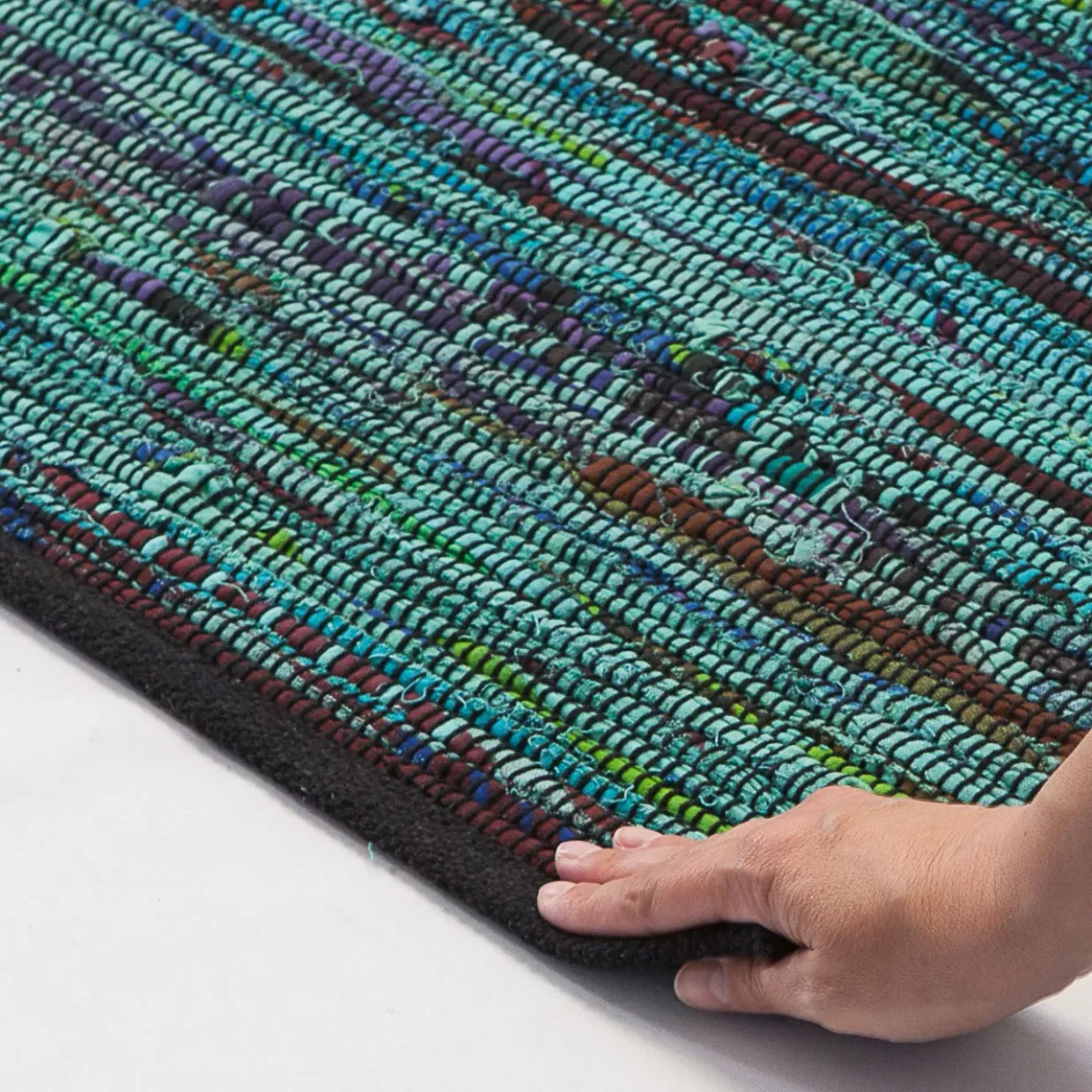 Handweb beidseitig verwendbar Größe: 60x90cm Farbton: Türkis Stil: Modern Muster und Motiv: Handweb Material: Textil Textilart: Baumwolle Flächengewicht: 1500 bestehend aus: 1 Teppich Highlights