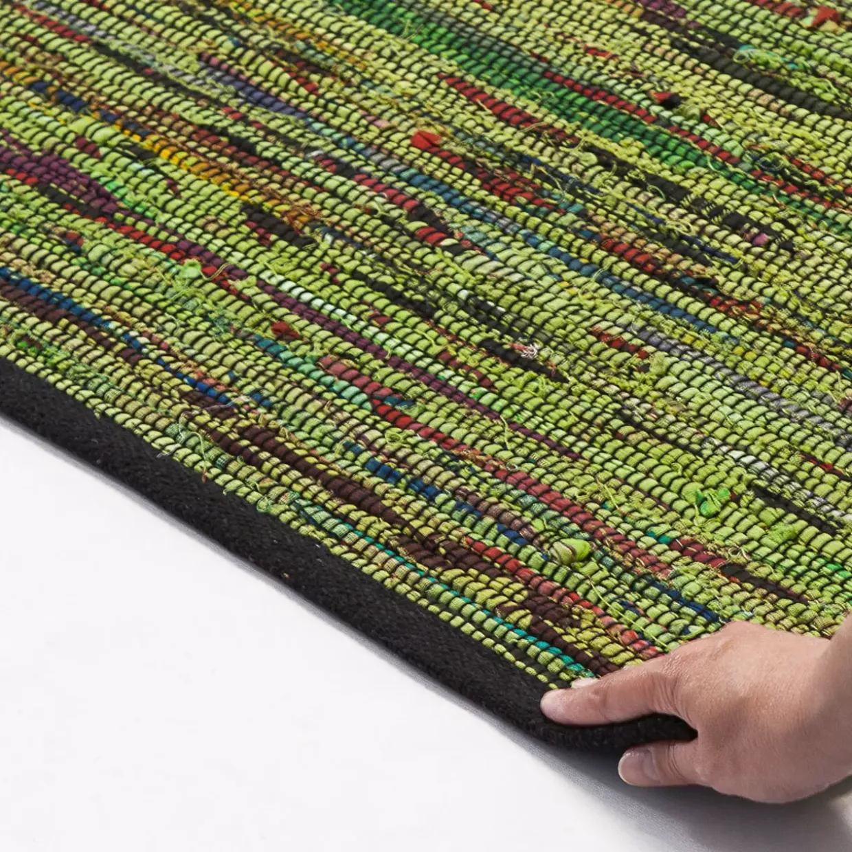 Ein schönes Farbspiel entfaltet sich in dieser konventionellen Chindi. Die grüne Farbgebung wird durch das kunstvolle Handweben auf harmonische Weise betont. Diese Chindi vereint traditionelle Handwerkskunst mit modernen Designansprüchen und bietet dadurch eine einzigartige ästhetische Erfahrung. Gefertigt aus einer Kombination von hochwertiger Baumwolle und anderen ausgewählten Fasern, steht das Material für Beständigkeit und gleichzeitigen Komfort.