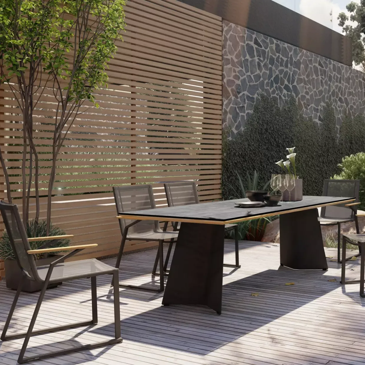 Graphitfarbenes Design trifft auf modernen Stil: Der Ajax Gartentisch vereint elegante Schlichtheit mit funktionaler Robustheit. Rechteckig in seiner Form, bietet dieser Tisch eine perfekte Kombination aus Teakholz und Stahl, die nicht nur visuell ansprechend ist, sondern auch durch ihre Langlebigkeit überzeugt.