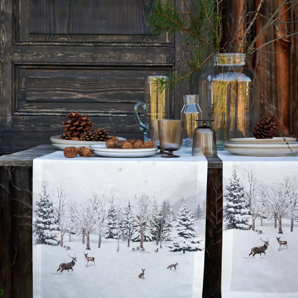 Verschneiter Wald als Muster verleiht diesem Tischläufer eine einzigartige Atmosphäre, die an ruhige Wintertage erinnert. Das rechteckige Design fügt sich nahtlos in moderne Einrichtungsstile ein und ergänzt stilvoll jede Tischdekoration. Die Kombination aus Baumwolle und Polyester sorgt für eine angenehme Haptik und Langlebigkeit, während die graue Farbgebung eine zeitlose Eleganz ausstrahlt.