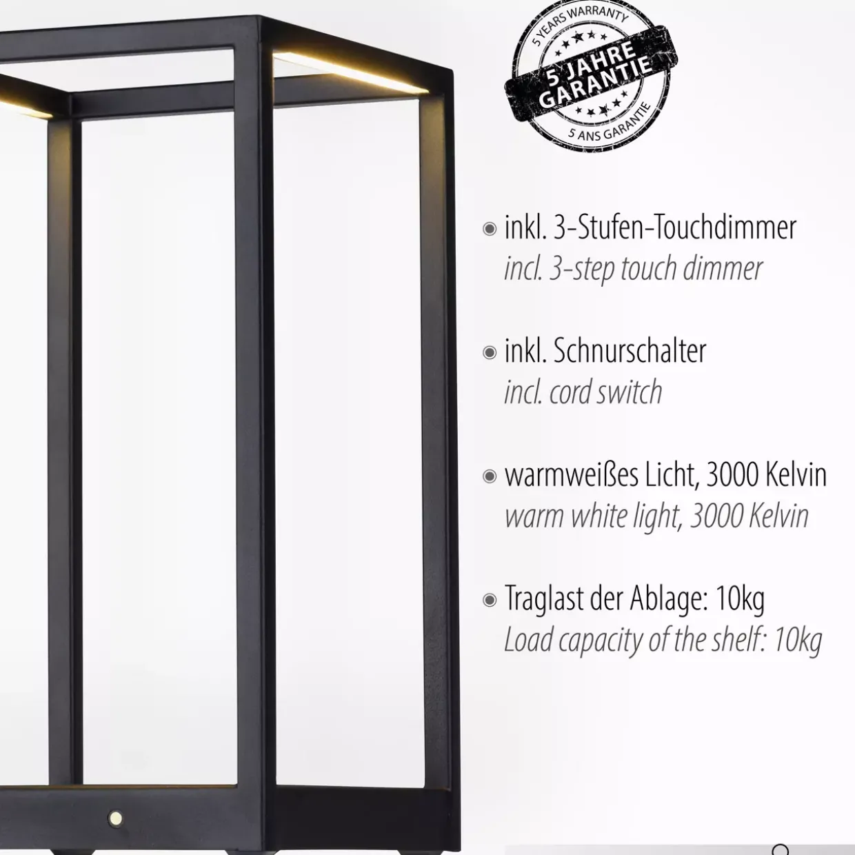 Gefertigt aus einer Kombination von Kunststoff und Metall, überzeugt die Leuchte durch ihre stabile und langlebige Konstruktion. Der Schnurschalter sorgt für eine einfache Bedienung, während die zusätzliche Ablagefläche mit einer Traglast von bis zu 10 kg funktionalen Mehrwert bietet.