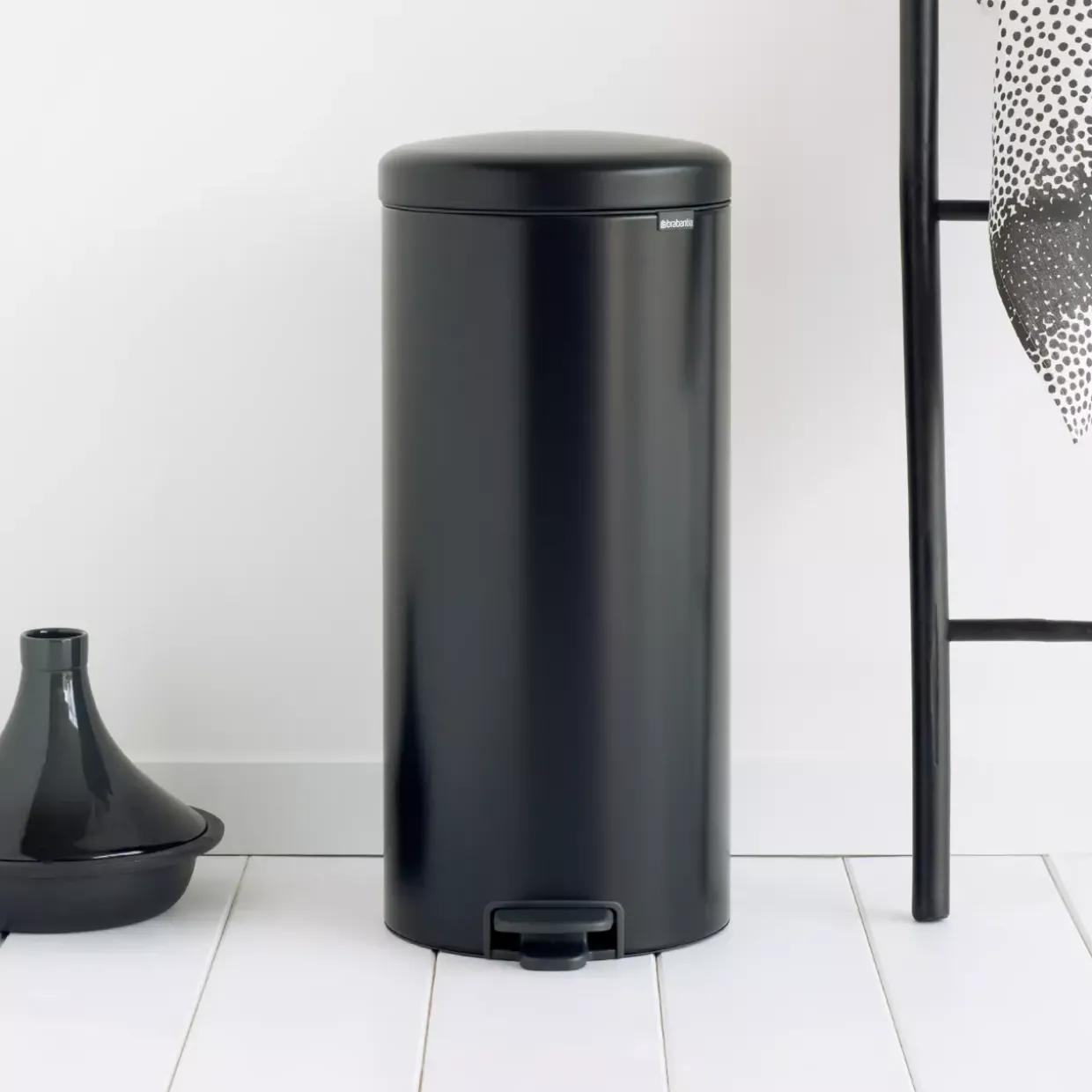 Der Newlcon Treteimer präsentiert sich in einem eleganten Design, das durch seine schwarz mattierte Oberfläche besticht. Diese moderne Note fügt sich nahtlos in jedes zeitgemäße Interieur ein und verleiht Ihrem Raum einen Hauch von Raffinesse. Innen und außen überzeugt er durch die gelungene Kombination aus Kunststoff und hochwertigem Stahl, die für Langlebigkeit und Stabilität sorgt.