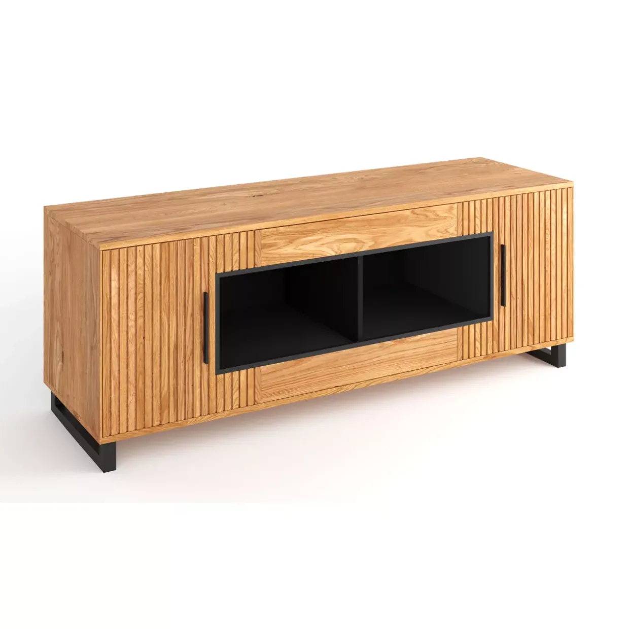 Farbton: Korpus Eiche furniert / Füße schwarz / Front Akustikpaneel Eiche / Griffe schwarz