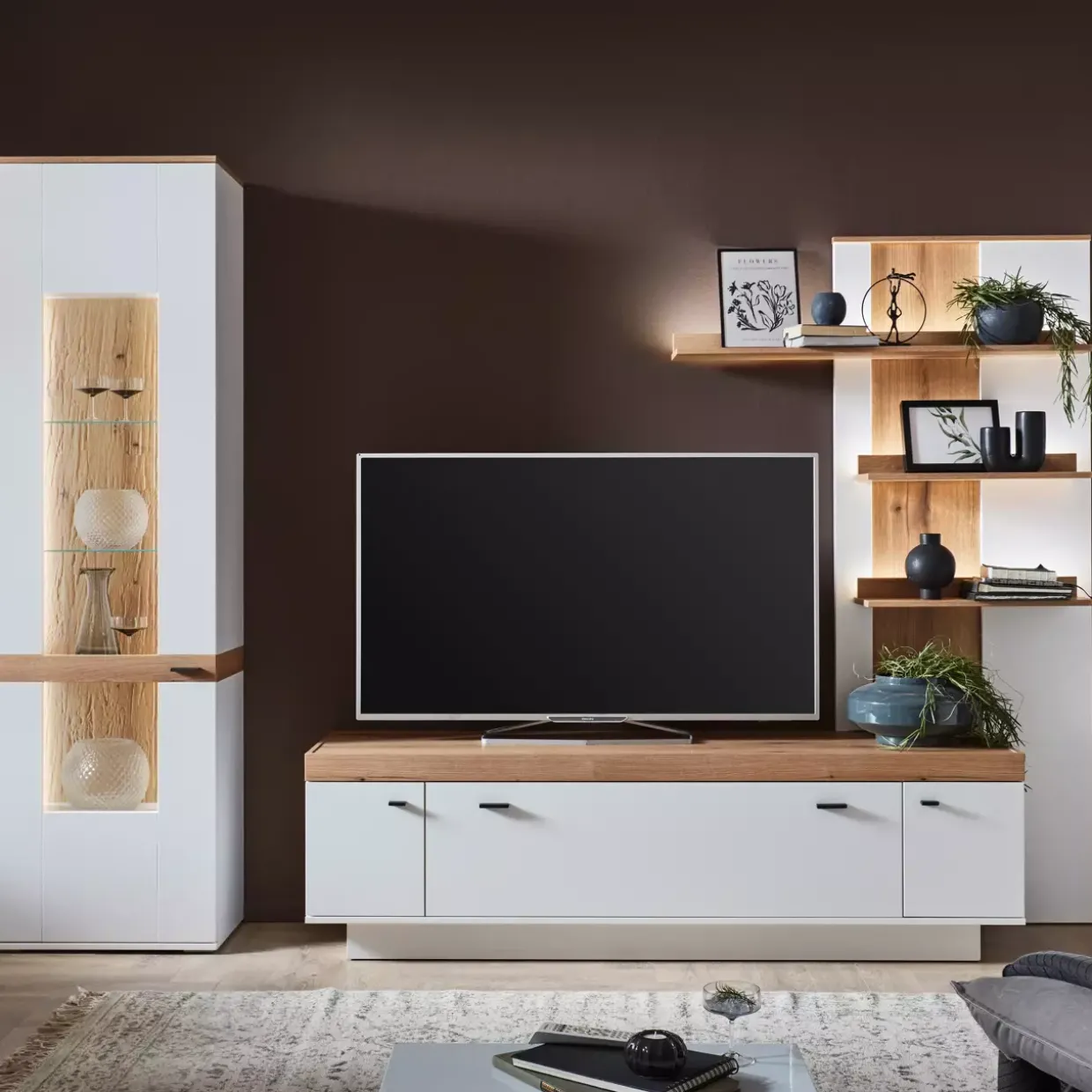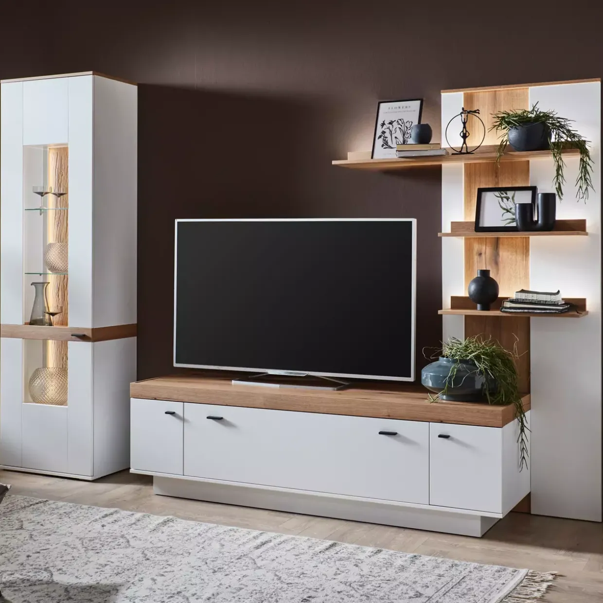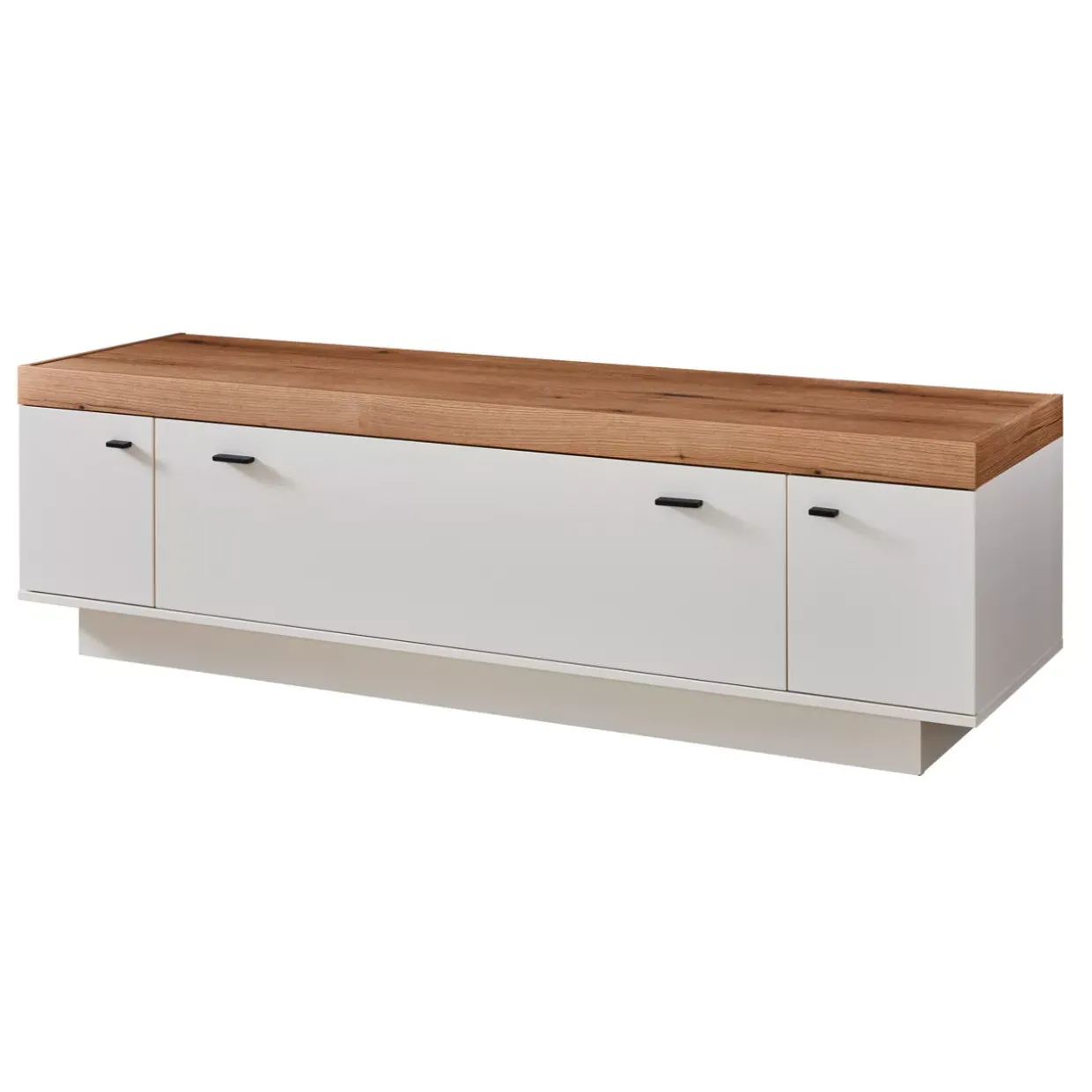 Schubkästen mit Unterflurführung und Dämpfung zeichnen das Bilbao Unterteil aus. Diese durchdachte Funktionalität sorgt für ein sanftes und leises Schließen der Schubkästen, was den Alltag angenehmer gestaltet. Die gelungene Kombination aus Weiß Dekor und Eiche Evoke Dekor verleiht diesem Möbelstück eine zeitlose Eleganz, die sich nahtlos in verschiedene Einrichtungsstile integrieren lässt. Zwei Türen und ein Doppelschubkasten bieten ausreichend Stauraum für Ihre persönlichen Gegenstände. Ob im Wohnzimmer, Esszimmer oder in der Diele – dieses Möbelstück ist vielseitig einsetzbar und überzeugt durch seine klare Linienführung und das konventionelle Design. Gefertigt aus hochwertigem Holzwerkstoff, vereint das Bilbao Unterteil Langlebigkeit mit einem modernen Look. Die Materialwahl sorgt nicht nur für Stabilität, sondern auch für eine ansprechende Optik, die den Raum aufwertet. Ein stilvolles und zugleich praktisches Möbelstück, das durch sein durchdachtes Design und die Kombination aus Funktionalität und Ästhetik besticht. Es bietet eine hervorragende Möglichkeit, Wohnräume zu organisieren und dabei einen Hauch von Eleganz zu verbreiten. Lassen Sie sich von der Balance zwischen Form und Funktion begeistern und entdecken Sie die Vielseitigkeit dieses Möbelstücks.