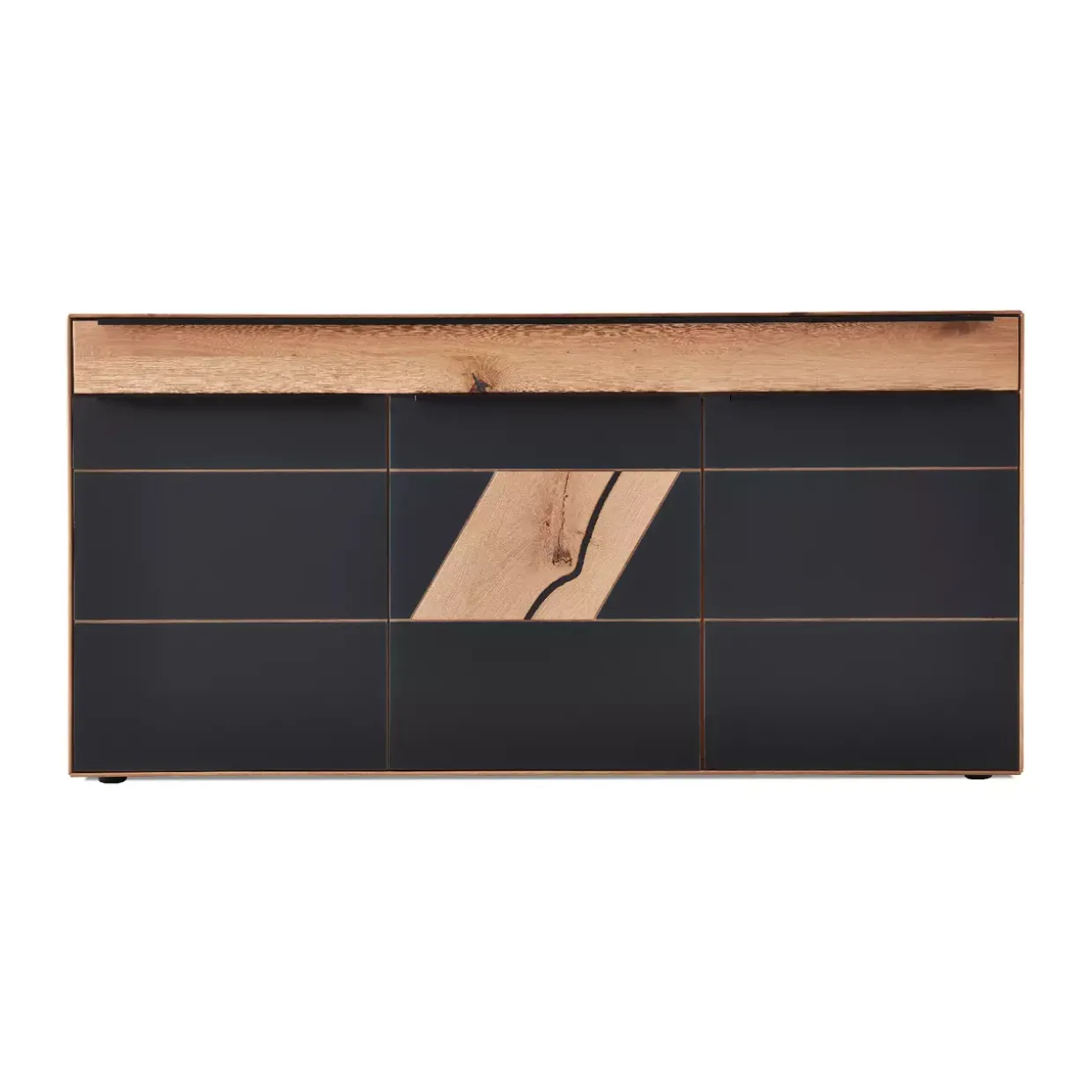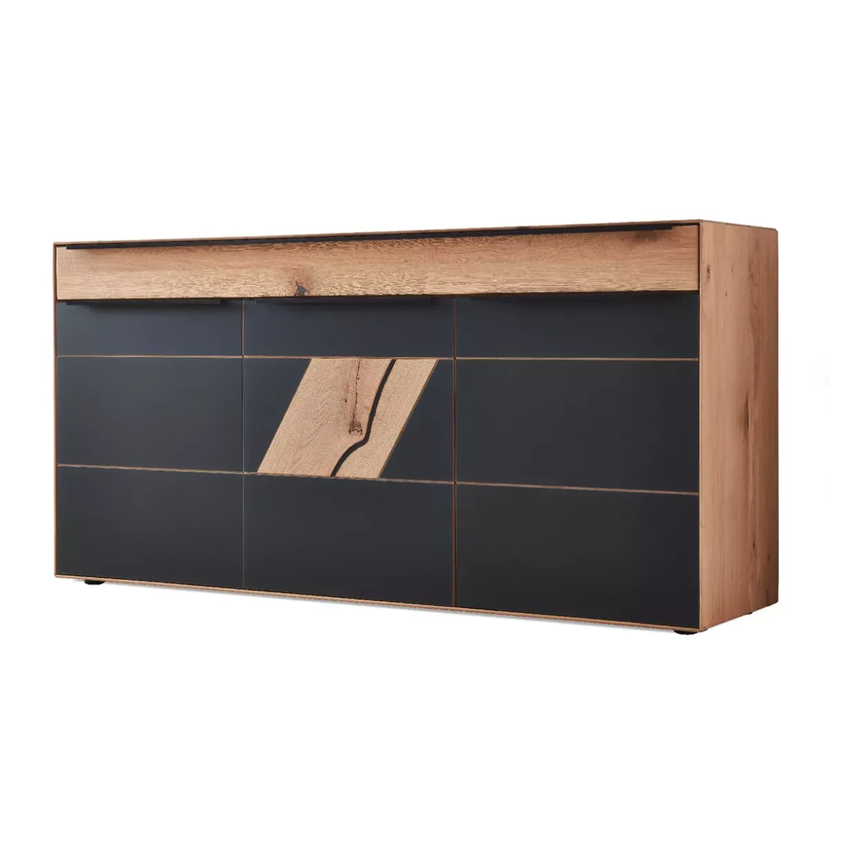 Robuste Asteiche, massiv gebürstet und bianco geölt, verleiht dem Sideboard Talvera seinen modernen Charme. Dieses Möbelstück vereint Eleganz und Funktionalität mit drei Drehtüren aus einer Kombination von Holz, Glas und Metall. Akzentuiert durch anthrazit satiniertes Farbglas und Risse in der Eiche, bietet es eine harmonische Ergänzung für zeitgenössische Wohnräume.
