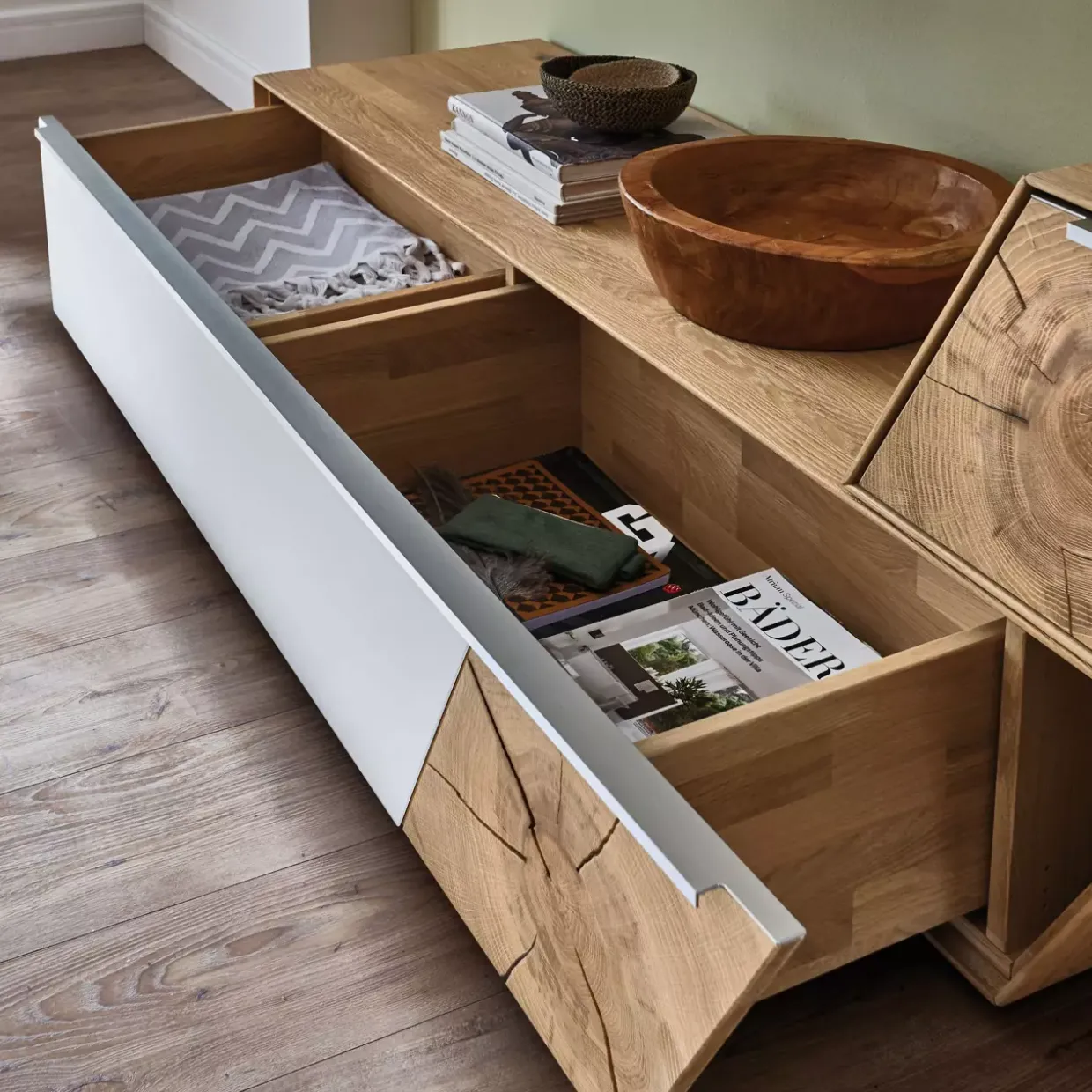 Die Oberfläche der Talvera Wohnkombination ist geölt, was nicht nur die natürliche Schönheit des Holzes betont, sondern auch für eine angenehme Haptik sorgt. Diese Wohnkombination passt perfekt in ein modernes Zuhause und bietet eine gelungene Mischung aus Ästhetik und Funktionalität.