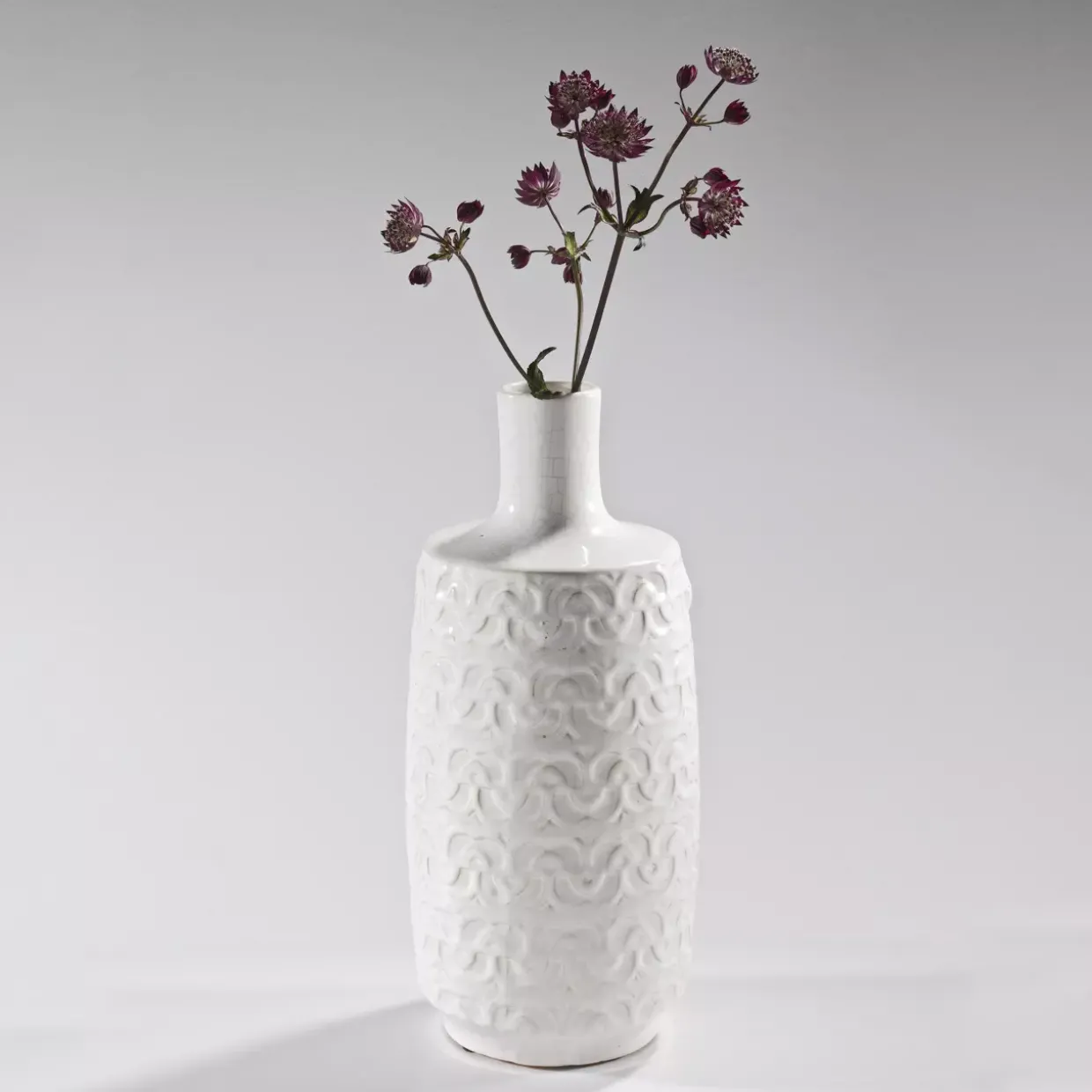 Weiße Töne bieten eine vielseitige Basis, die sich mühelos mit anderen Farben und Materialien kombinieren lässt. Ob als zentrales Element auf einem Tisch oder als dezente Ergänzung in einem Regal, die Vase setzt überall stilvolle Akzente. Ihre glatte Oberfläche reflektiert Licht auf eine besondere Weise, wodurch die Vase je nach Lichteinfall unterschiedlich wirken kann.