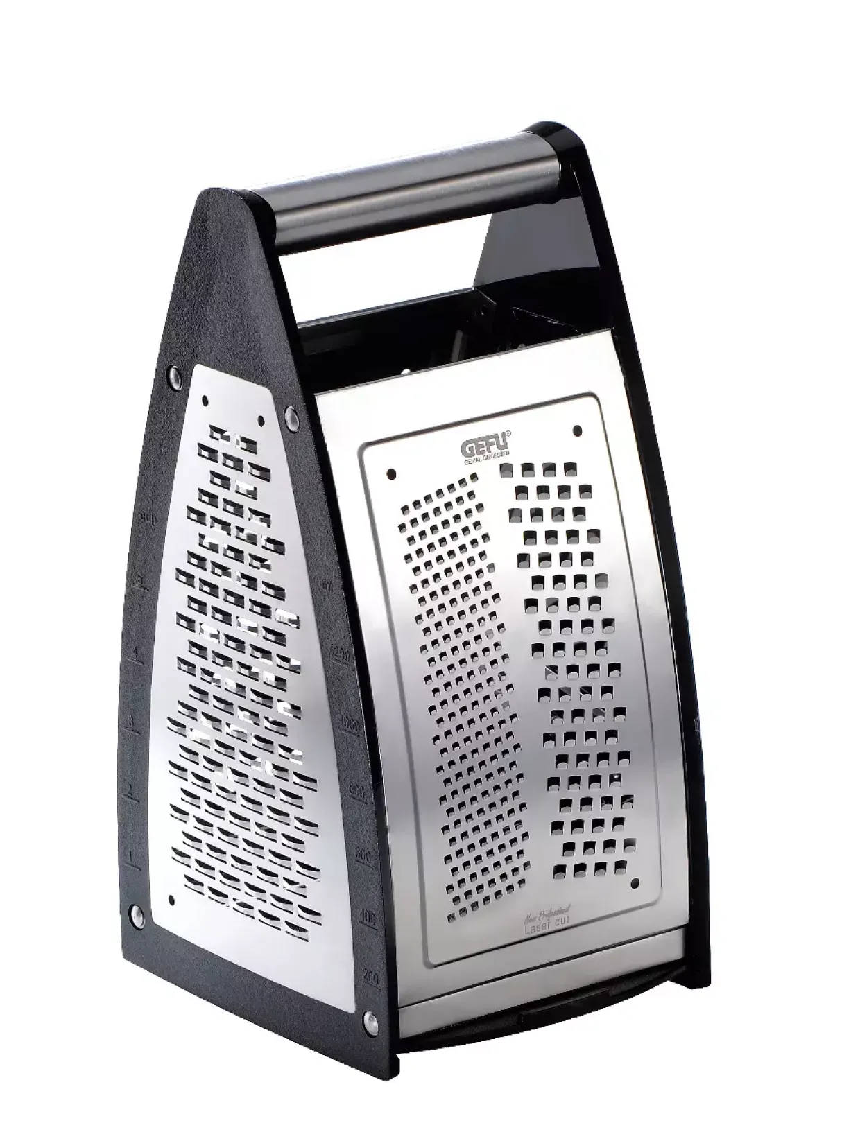Die Vielseitigkeit der Allzweckreibe Quinto beeindruckt auf den ersten Blick. Mit ihrem modernen Stil und der eleganten schwarz/silbernen Farbgebung fügt sie sich nahtlos in jede Küche ein. Die Vierkantreibe ist mehr als nur ein funktionales Küchengerät; sie ist ein Meisterwerk der Präzision und Effizienz. Die vier verschiedenen Reibflächen bieten für jede Aufgabe die passende Lösung: Ob feines Reiben von Weichkäse, grobes Zerkleinern von Gemüse oder das gleichmäßige Hobeln von Gurken und Kartoffeln – alles gelingt mühelos.