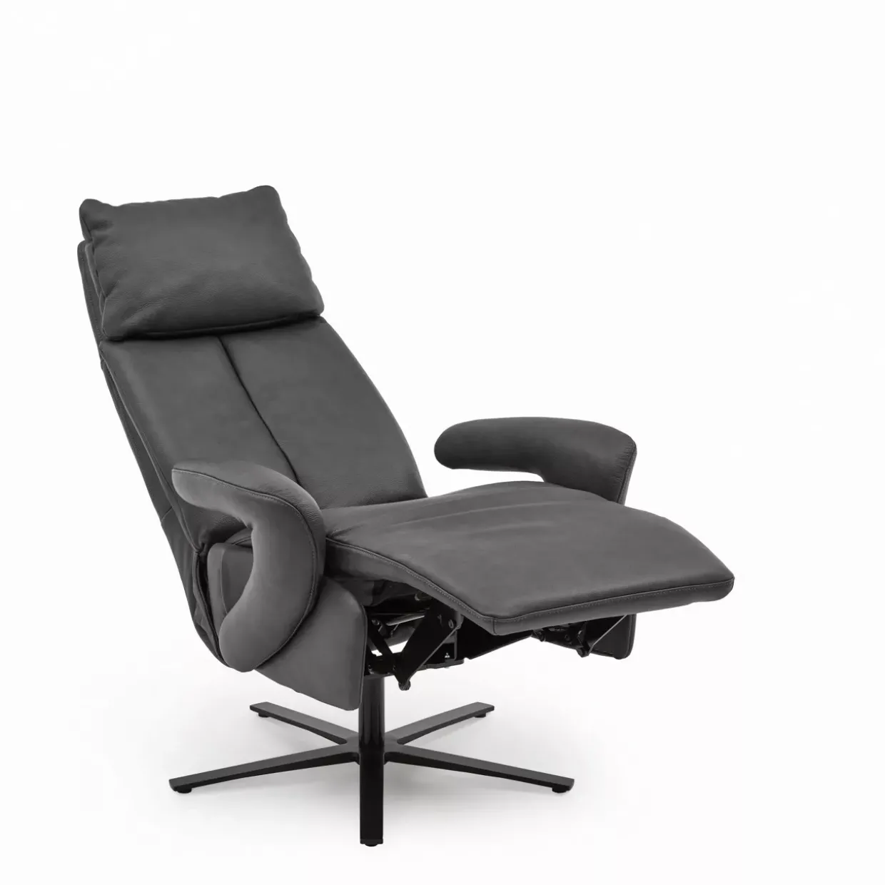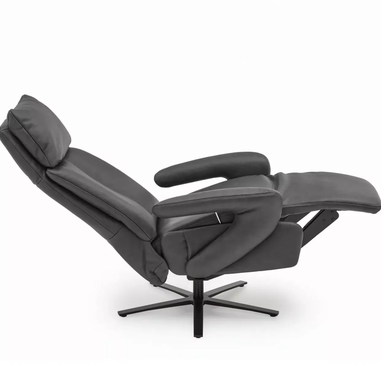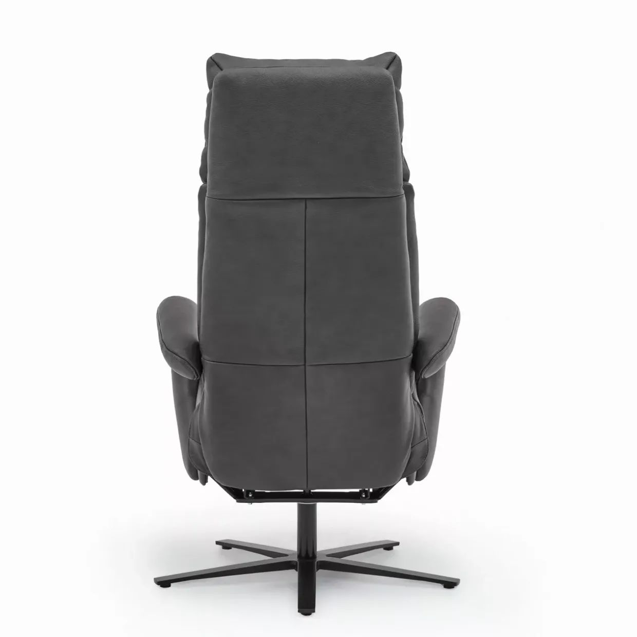 Eleganz trifft auf Funktionalität: Der Drehstuhl in Leder Reno anthrazit vereint stilvoll konventionelles Design mit modernem Komfort. Die manuelle Verstellung der Fußstütze, ausgestattet mit einem extra langen Fußteil, sorgt für optimalen Komfort. Dank der stufenlosen Verstellbarkeit durch leichten Körperdruck können Sie mühelos in die Liegeposition gleiten und entspannen.Mit einem Sternfuß aus hochwertigem Metall steht dieser Stuhl für Stabilität und Langlebigkeit. Die Kopfteilverstellung lässt sich individuell anpassen und bietet durch einen Rastbeschlag mit Rückholfeder zusätzliche Flexibilität. Der Echtbezug am Rücken garantiert ein durchgängiges, luxuriöses Sitzgefühl.Der Drehstuhl besticht durch seine lackierte Oberfläche und die Ton-in-Ton Kontrastnaht, die ihm eine dezente, aber edle Optik verleiht. Die Kombination aus Leder und Metall strahlt eine zeitlose Eleganz aus, die sich in jedem Raum harmonisch einfügt.Die Polsterung aus PUR-Schaum bietet hervorragenden Sitzkomfort, während die Relaxfunktion für zusätzliche Entspannung sorgt. Dieser Stuhl ist nicht nur ein Möbelstück, sondern ein Ort der Erholung und des Wohlbefindens. Lassen Sie sich von der Balance aus Komfort und Stil inspirieren und genießen Sie das Gefühl von Luxus in Ihrem Alltag.