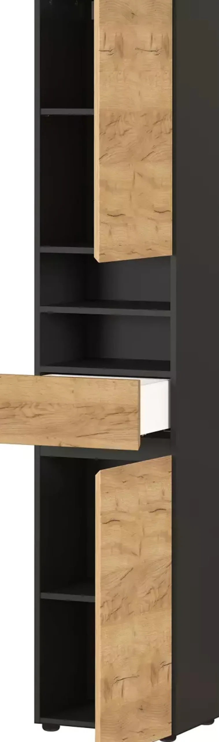Graphitfarbene Akzente treffen auf die warme Ausstrahlung der Navarra Eiche Nachbildung und verleihen dem Modell Mayor eine moderne Eleganz. Dieser Hochschrank überzeugt durch seine durchdachte Gestaltung: Eine Schublade mit Soft-Close-Technik, zwei Türen mit Türdämpfung und ein offenes Fach bieten vielseitige Stauraummöglichkeiten. Die verstellbaren Einlegeböden hinter den Türen ermöglichen eine flexible Nutzung des Innenraums. Gefertigt aus hochwertigem Holzwerkstoff und Metall, verspricht der Schrank Langlebigkeit und Stabilität.