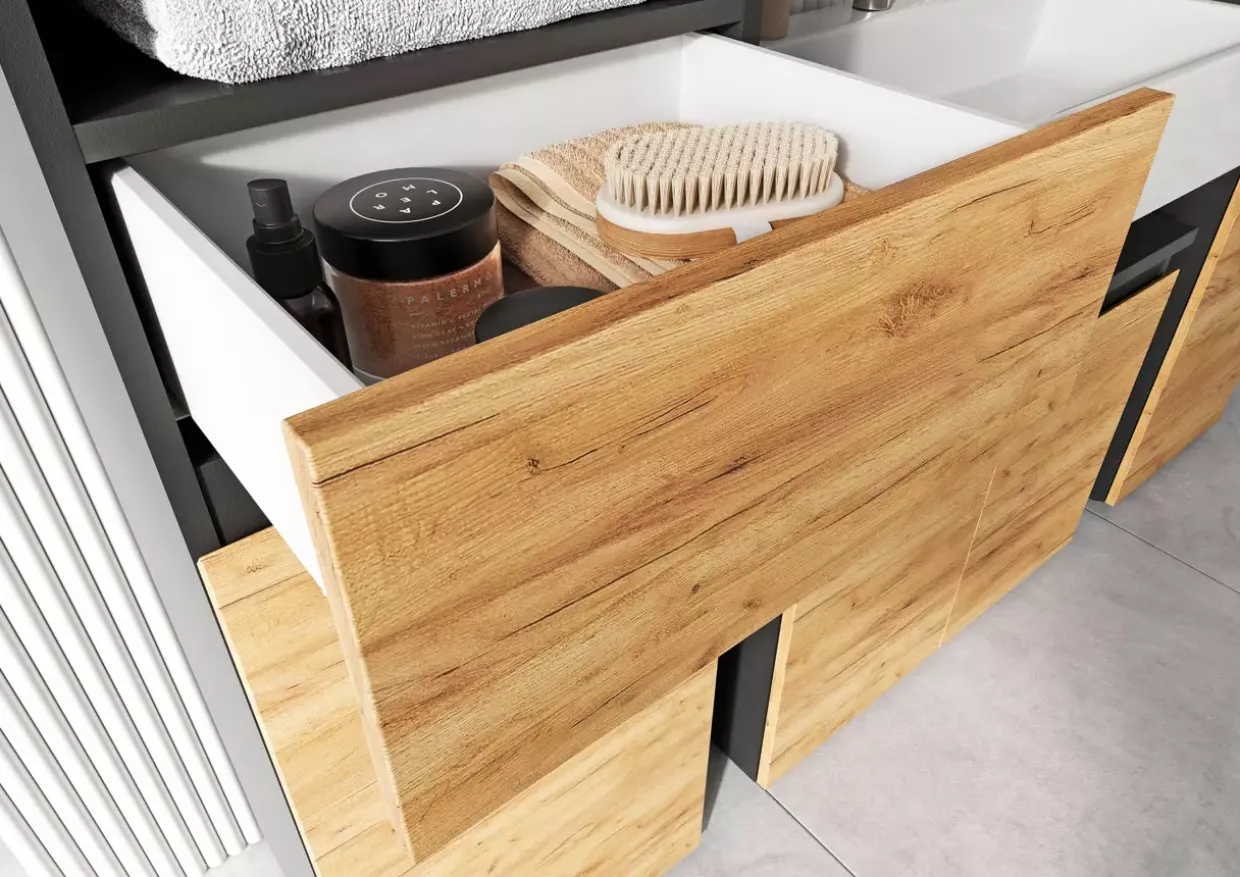 Besonders hervorzuheben sind die melaminharzbeschichteten Oberflächen, die nicht nur kratzfest und feuchtigkeitsabweisend sind, sondern auch eine grifflos elegante Optik bieten. Die robusten ABS-Kanten erhöhen die Stoß- und Schlagfestigkeit, was zu einer längeren Lebensdauer beiträgt. Die Push-To-Open-Funktion der Türen unterstreicht das moderne Design und sorgt für ein müheloses Öffnen.