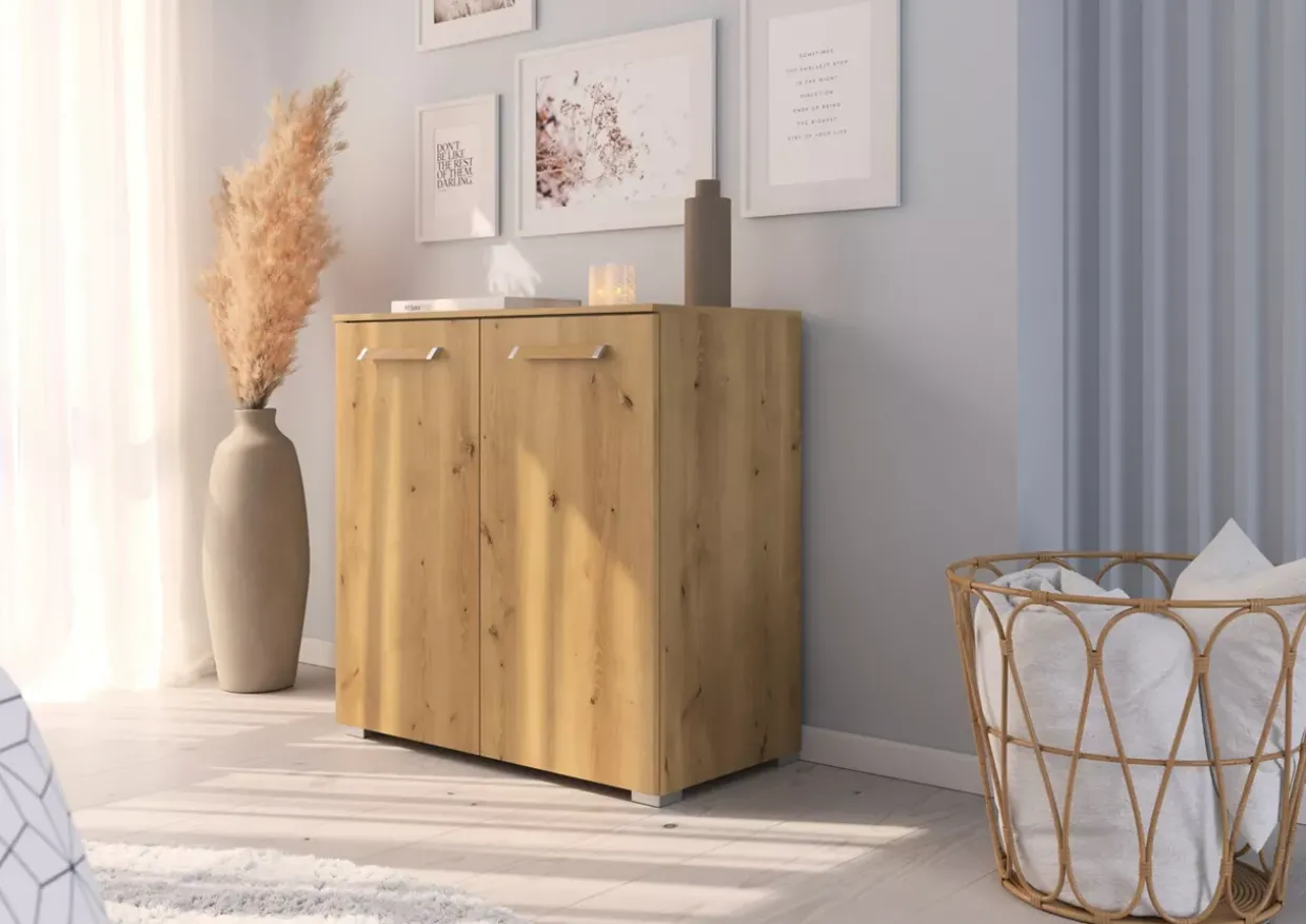 Die Asteiche Nachbildung verleiht der Cherie Kommode einen natürlichen und warmen Charme. Dieses Möbelstück fügt sich nahtlos in jedes Wohnambiente ein und unterstreicht dabei einen stilvollen und modernen Einrichtungsstil. Hergestellt aus hochwertigem Holzwerkstoff, bietet die Kommode nicht nur optische Anziehungskraft, sondern auch Langlebigkeit und Stabilität. Ein besonderes Highlight sind die integrierten Softdämpfer in den Türscharnieren, die ein sanftes und geräuschloses Schließen der Türen ermöglichen. Mit einer Anzahl von zwei Einheiten bietet die Kommode vielseitige Einsatzmöglichkeiten, sei es im Wohnzimmer, Schlafzimmer oder im Flur. Die sorgfältige Verarbeitung und das durchdachte Design machen sie zu einem funktionalen und ästhetischen Möbelstück in Ihrem Zuhause. Die Kombination aus natürlichem Stil und moderner Funktionalität bietet sowohl praktische als auch visuelle Vorteile. Der Holzwerkstoff sorgt dafür, dass die Kommode leicht zu pflegen ist, ohne dass die natürliche Ausstrahlung verloren geht. Die Cherie Kommode könnte genau das richtige Element sein, um Ihrem Raum eine angenehme und einladende Atmosphäre zu verleihen. Entdecken Sie die harmonische Verbindung von Design und Funktionalität in Ihrem Wohnkonzept.