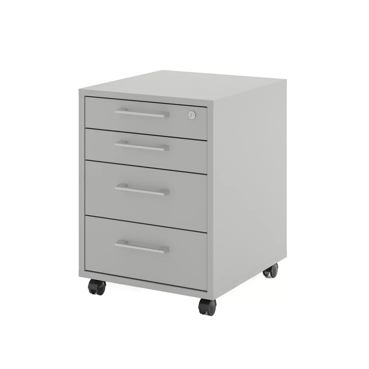 Der Rollcontainer, in stilvollem Kreidegrau gehalten, bietet eine moderne Ergänzung für jedes Büro. Die durchdachte Kombination aus Holzwerkstoff, Kunststoff und Aluguss verleiht ihm nicht nur Stabilität, sondern auch eine ansprechende Optik. Mit vier praktischen Rollen lässt sich der Container mühelos verschieben, was Flexibilität in der Raumgestaltung ermöglicht.