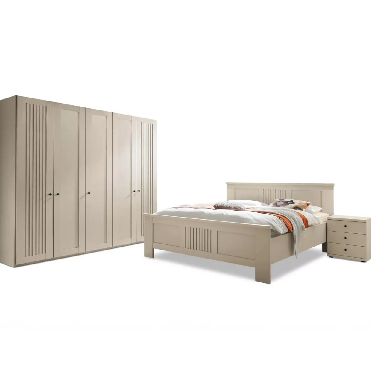 Die Linate VITO Schlafzimmerkombination vereint durchdachtes Design mit funktionaler Eleganz. Inklusive Kopf- und Fußteil mit Kassetten mit Lamellen bietet dieses Möbelstück eine harmonische Ergänzung für Ihr Schlafzimmer. Die Kombination aus Holzwerkstoff und Metall sorgt für eine stabile und langlebige Konstruktion, die gleichzeitig modern und zeitlos wirkt.Kieselgrau und Schwarz fügen sich nahtlos in jedes Raumkonzept ein und schaffen eine beruhigende Atmosphäre. Zwei Nachtschränke mit jeweils drei Auszügen bieten reichlich Stauraum für persönliche Gegenstände und sorgen dafür, dass alles griffbereit ist. Praktische Metall-Kleiderstangen in robusten Metallhalterungen sind perfekt, um Ihre Kleidung ordentlich und übersichtlich aufzubewahren.Diese Schlafzimmerkombination überzeugt nicht nur durch ihr stilvolles Äußeres, sondern auch durch ihre durchdachte Funktionalität. Die hochwertigen Materialien und die präzise Verarbeitung gewährleisten, dass Sie lange Freude an diesem Möbelstück haben werden. Egal, ob Sie ein klassisches oder modernes Ambiente bevorzugen, das Design passt sich flexibel an Ihre Bedürfnisse an.Lassen Sie sich von der Vielseitigkeit und dem Charme dieser Schlafzimmerkombination begeistern und schaffen Sie sich einen Rückzugsort, der Stil und Komfort vereint.