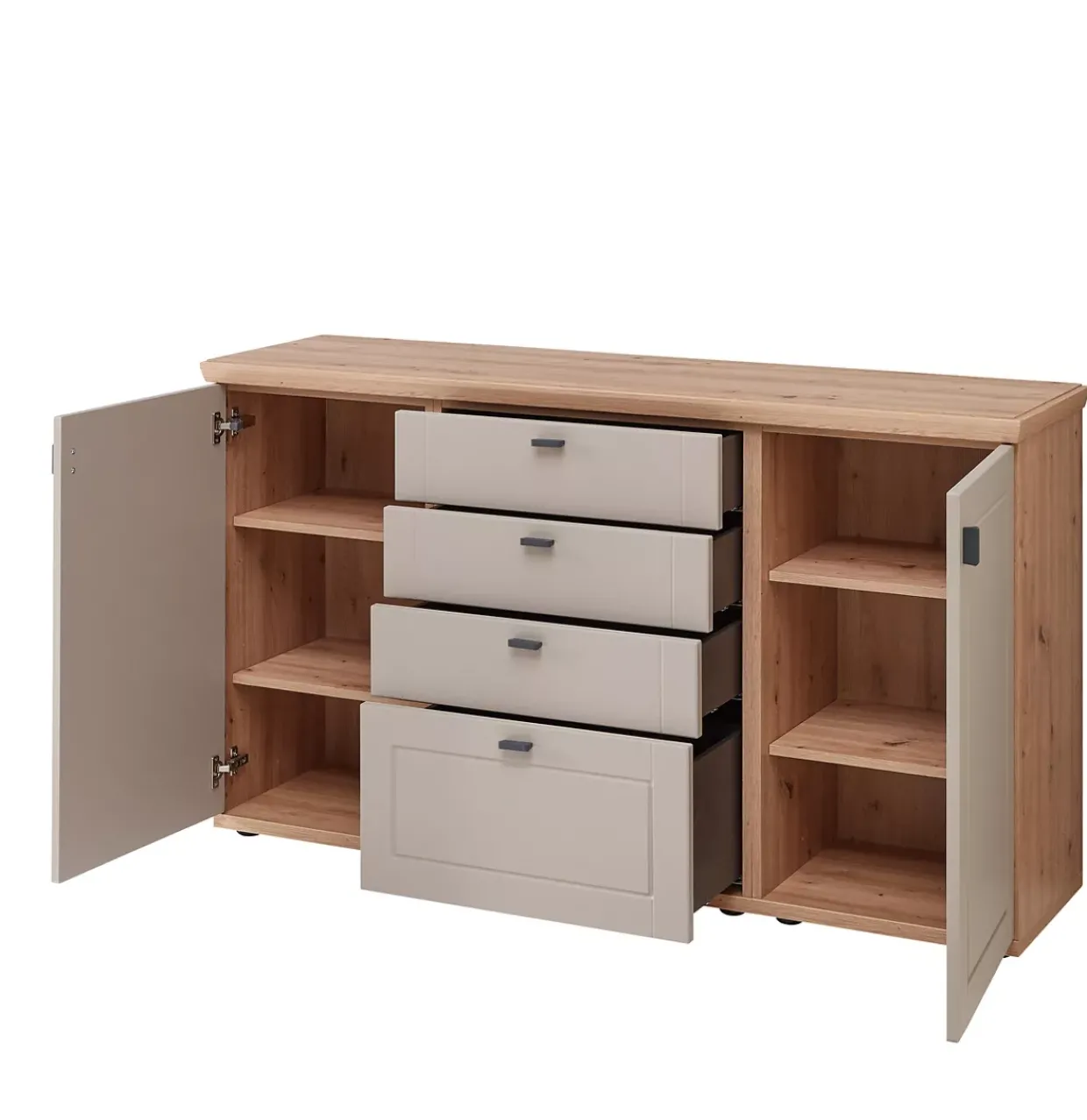 Vielseitigkeit trifft auf Funktionalität: Das Sideboard bietet ausreichend Stauraum für verschiedenste Gegenstände und lässt sich mühelos in unterschiedliche Wohnstile integrieren. Ob im Wohnzimmer als Ablage für Mediengeräte oder im Esszimmer zur Aufbewahrung von Geschirr – die Nutzungsmöglichkeiten sind nahezu unbegrenzt.