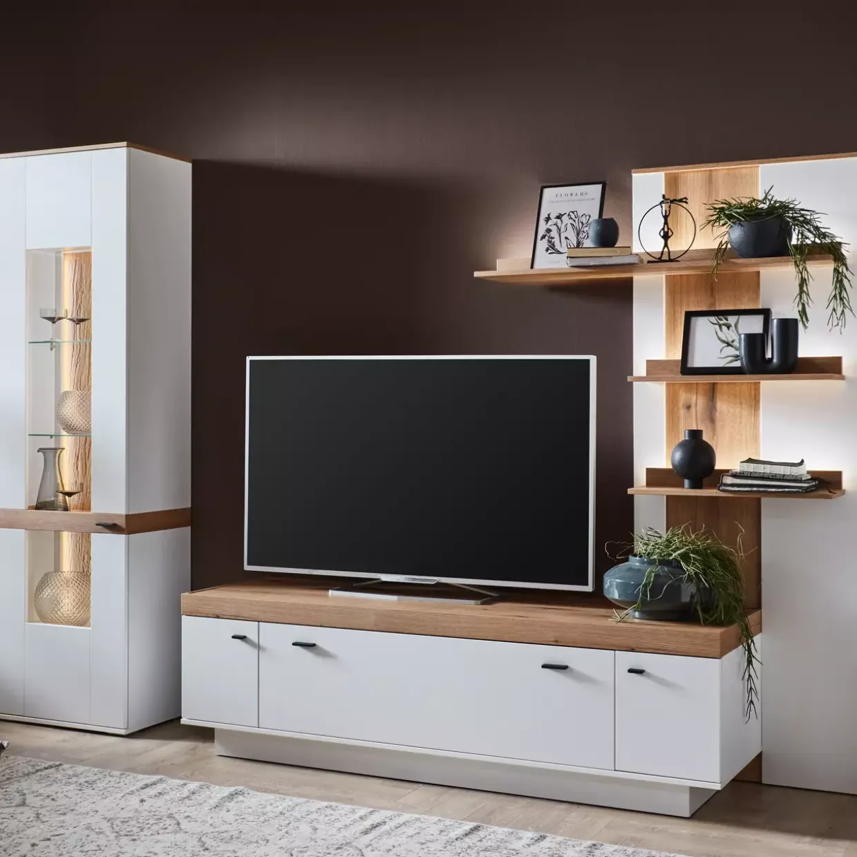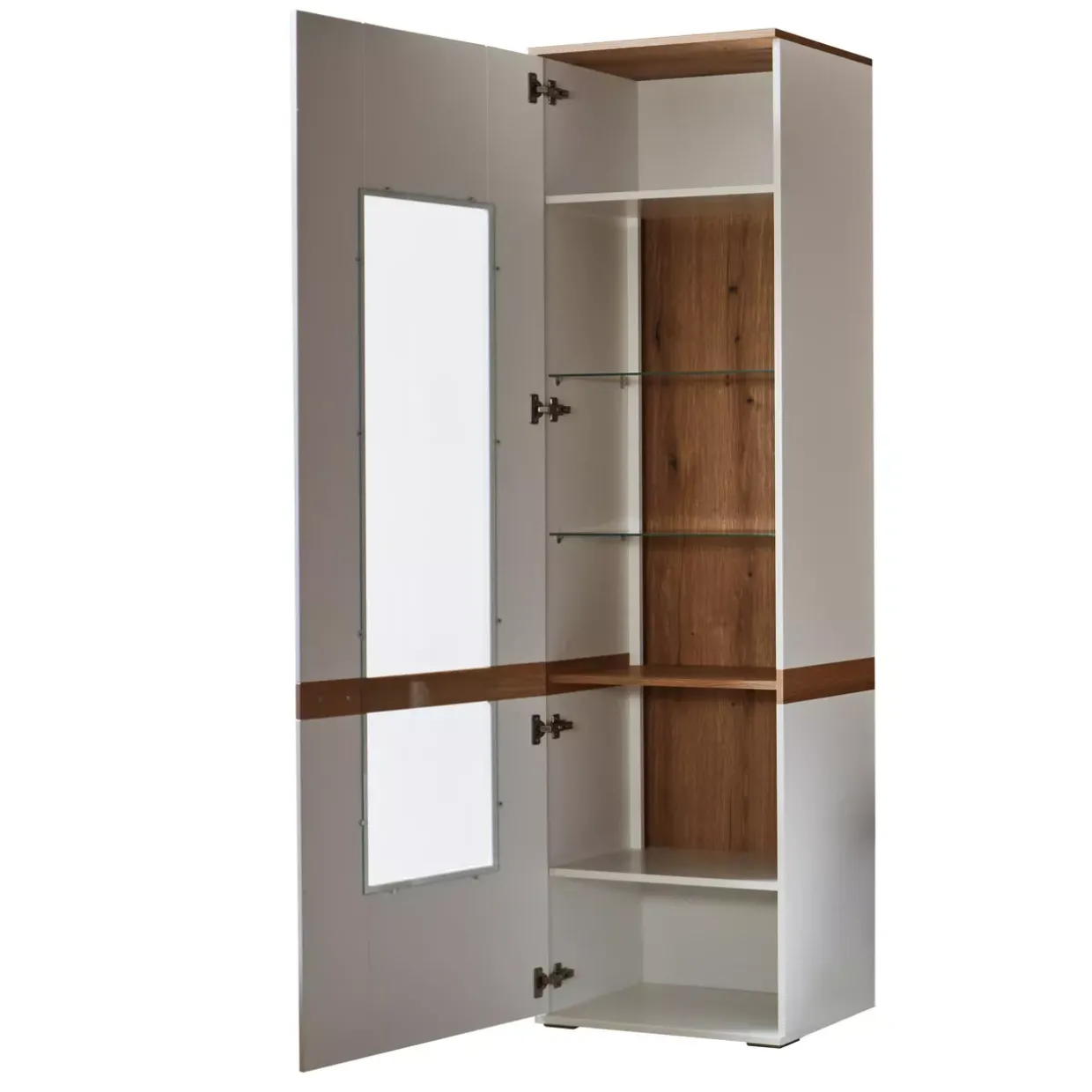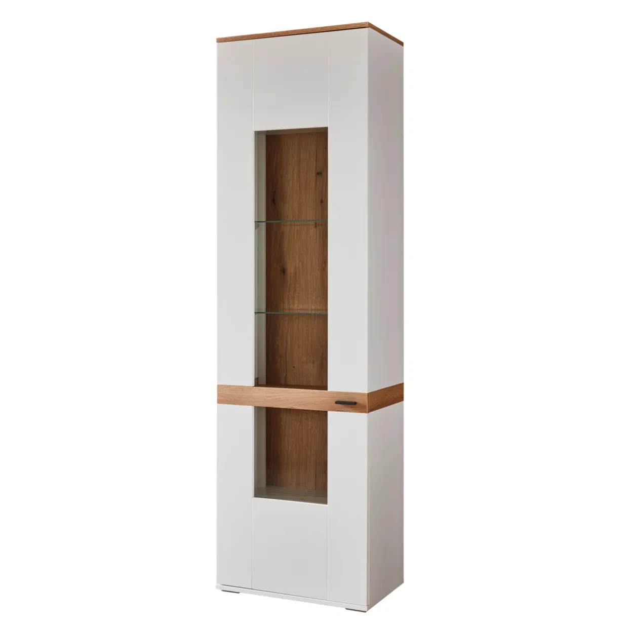 Eine stilvolle Ergänzung für Ihr Zuhause: Die Vitrine Bilbao, gefertigt aus einer harmonischen Kombination von Glas und Holzwerkstoff, vereint Eleganz und Funktionalität. Besonders hervorzuheben ist die Glastür, die den Blick auf Ihre dekorativen Schätze freigibt, während das Klarglas für eine klare, ungehinderte Sicht sorgt. Das Design in Weiß Dekor und Eiche Evoke Dekor wird durch die sichtbaren Rückwände in sandgestrahlter Eiche Evoke Optik geschmackvoll abgerundet. Diese Materialien schaffen eine warme und einladende Atmosphäre, die sich wunderbar in konventionelle Einrichtungsstile einfügt.Ein weiteres Highlight ist die Möglichkeit, die Vitrine mit einer passenden Beleuchtung auszustatten, die auf Anfrage erhältlich ist. So können Sie Ihre Lieblingsstücke ins rechte Licht rücken und für eine stimmungsvolle Umgebung sorgen. Die Vitrine bietet nicht nur eine ästhetische Präsentationsfläche, sondern auch eine praktische Lösung zur Aufbewahrung. Ob im Wohnzimmer, Esszimmer oder Flur – sie fügt sich nahtlos in verschiedene Wohnbereiche ein und bringt zeitlose Eleganz in Ihren Raum. Mit der Wahl dieser Vitrine entscheiden Sie sich für ein Möbelstück, das durch seine hochwertige Verarbeitung und sein durchdachtes Design besticht. Ein wahres Schmuckstück für Ihr Zuhause.