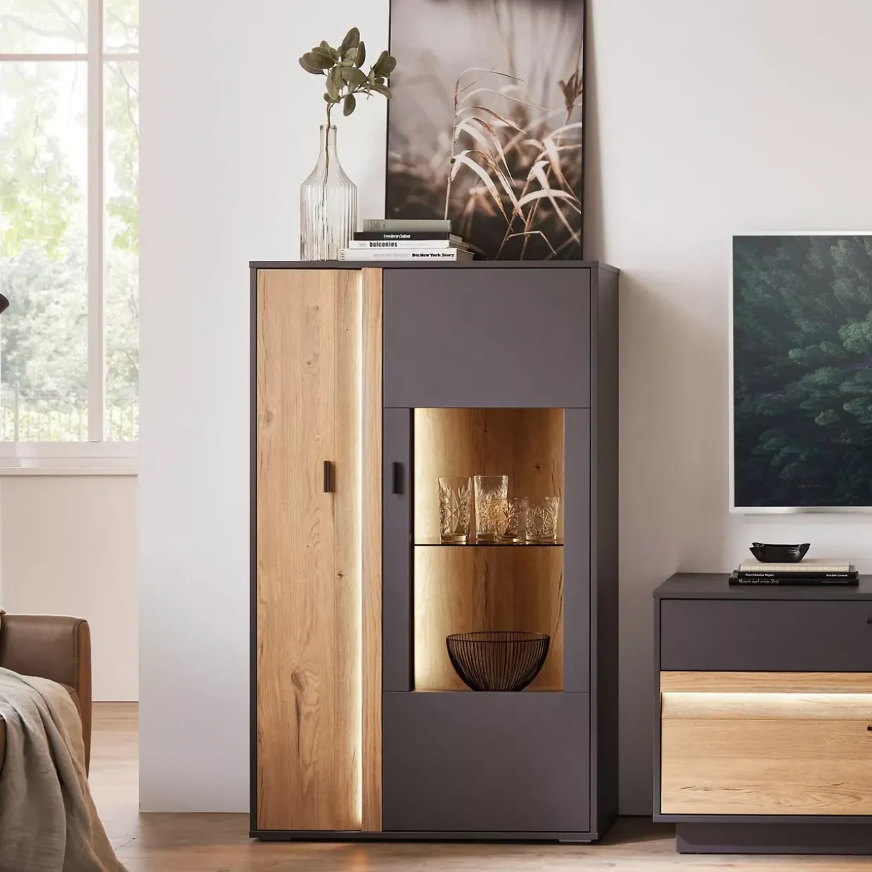 Die Butera Vitrine verkörpert ein harmonisches Zusammenspiel aus zeitlosem Design und Funktionalität. Anthrazit Dekor gepaart mit einer Absetzung in Eiche Gustavson Dekor verleiht dem Möbelstück eine elegante Ausstrahlung. Diese Kombination aus Holzwerkstoff und Metall sorgt für eine stabile und langlebige Konstruktion.Ein besonderes Highlight der Vitrine ist die integrierte Frontbeleuchtung, die für eine stimmungsvolle Atmosphäre sorgt und die ausgestellten Objekte ins rechte Licht rückt. Die Vitrine ist mit einer Holztür und einer Glastür ausgestattet, was sowohl Stauraum als auch Präsentationsmöglichkeiten bietet. Diese Türen ermöglichen es, wertvolle Sammlerstücke oder persönliche Erinnerungsstücke stilvoll zu präsentieren und gleichzeitig sicher aufzubewahren.Der konventionelle Stil der Vitrine passt sich mühelos verschiedenen Wohnkonzepten an und fügt sich nahtlos in bestehende Einrichtungskonzepte ein. Durch die klare Linienführung und die ansprechende Materialwahl wird die Vitrine zu einem zeitlosen Möbelstück, das in jedem Raum Akzente setzt. Lassen Sie sich von der Vielseitigkeit und Ästhetik der Butera Vitrine inspirieren und entdecken Sie, wie dieses Möbelstück Ihrem Zuhause eine besondere Note verleihen kann. Die durchdachte Gestaltung und hochwertige Verarbeitung machen sie zu einer Bereicherung für jeden Wohnraum.