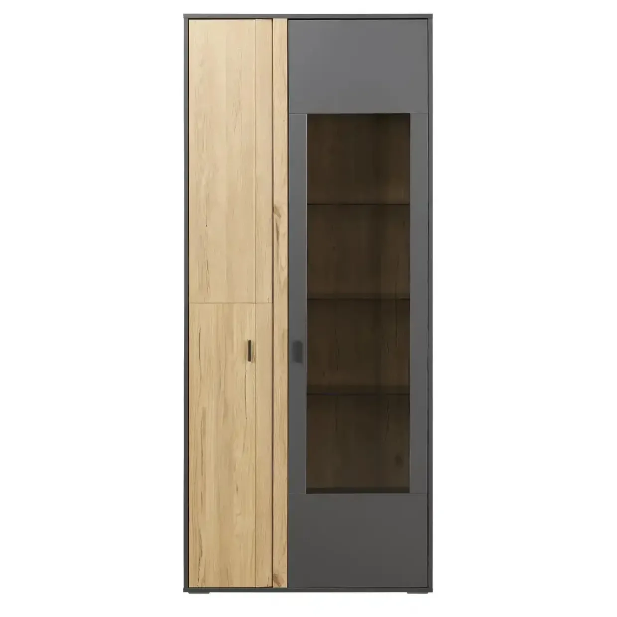 Ein stimmungsvolles Highlight setzt die integrierte Frontbeleuchtung der Vitrine Butera. In einem klassischen Stil gehalten, kombiniert dieses Möbelstück Funktionalität mit einer ansprechenden Ästhetik. Die Farbgebung in Anthrazit Dekor, ergänzt durch die Absetzung in Eiche Gustavson Dekor, verleiht Ihrer Inneneinrichtung eine harmonische und zugleich moderne Note.Hergestellt aus robusten Materialien wie Holzwerkstoff und Metall, verspricht die Vitrine Langlebigkeit und Stabilität. Sie bietet mit einer Holztür und einer Glastür vielseitige Möglichkeiten der Präsentation und Aufbewahrung. Während hinter der Holztür persönliche Gegenstände diskret verstaut werden können, präsentiert die Glastür Ihre schönsten Dekorationsobjekte oder Sammlerstücke stilvoll.Die Butera Vitrine ist nicht nur ein praktisches Möbelstück, sondern auch ein elegantes Designelement, das in verschiedenen Räumen perfekt zur Geltung kommt. Ob im Wohnzimmer, Essbereich oder in der Diele – sie fügt sich nahtlos in unterschiedliche Einrichtungsstile ein und bietet dabei genügend Stauraum für Ihre Bedürfnisse.Beim Betrachten der Vitrine wird schnell klar: Hier trifft durchdachtes Design auf Funktionalität. Mit ihrem zeitlosen Charme und den hochwertigen Materialien wird sie zu einem wesentlichen Bestandteil jeder stilvoll eingerichteten Wohnung.