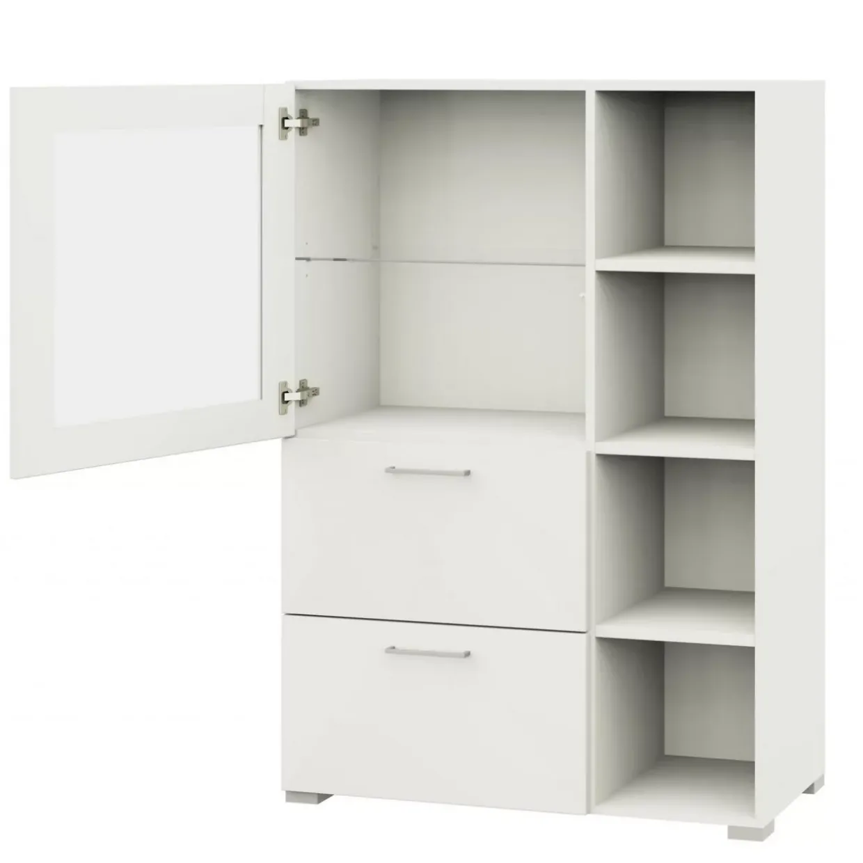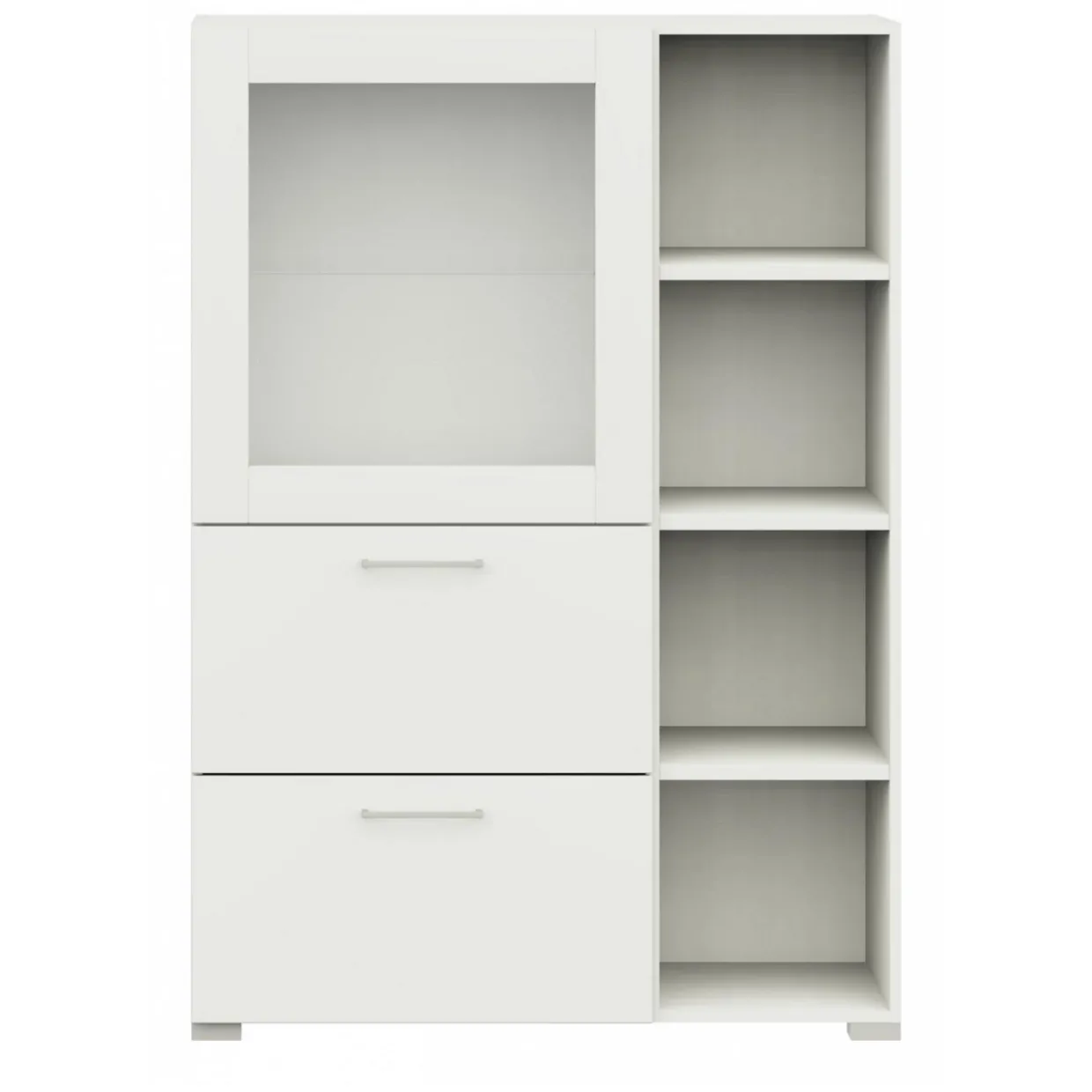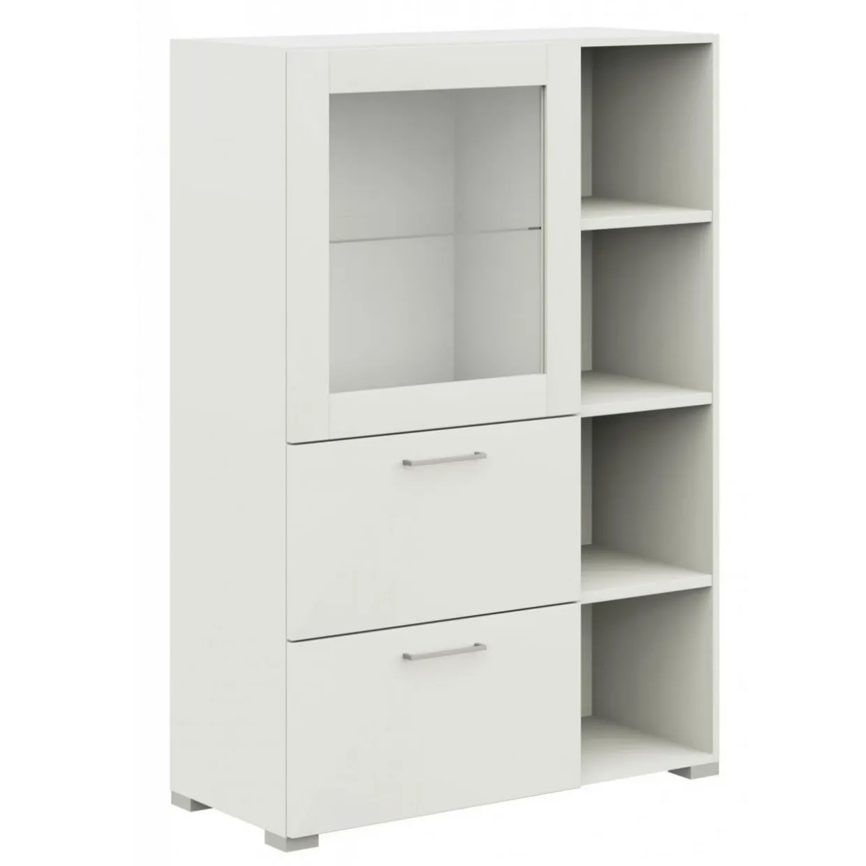 Das 4-Fußgestell verleiht der Vitrine eine solide Basis und garantiert Standfestigkeit auf verschiedenen Bodenbelägen. Der moderne Stil und die dezente Farbgebung in Kombination mit Edelstahl-Optik machen dieses Möbelstück zu einem flexiblen Begleiter in Ihrer Inneneinrichtung. Diese Vitrine vereint Funktionalität mit einem ästhetischen Design und eignet sich ideal für Liebhaber hochwertiger und zeitgemäßer Einrichtungslösungen.
