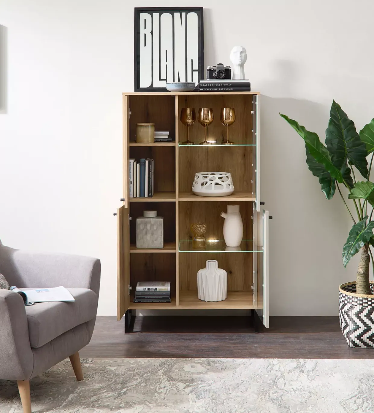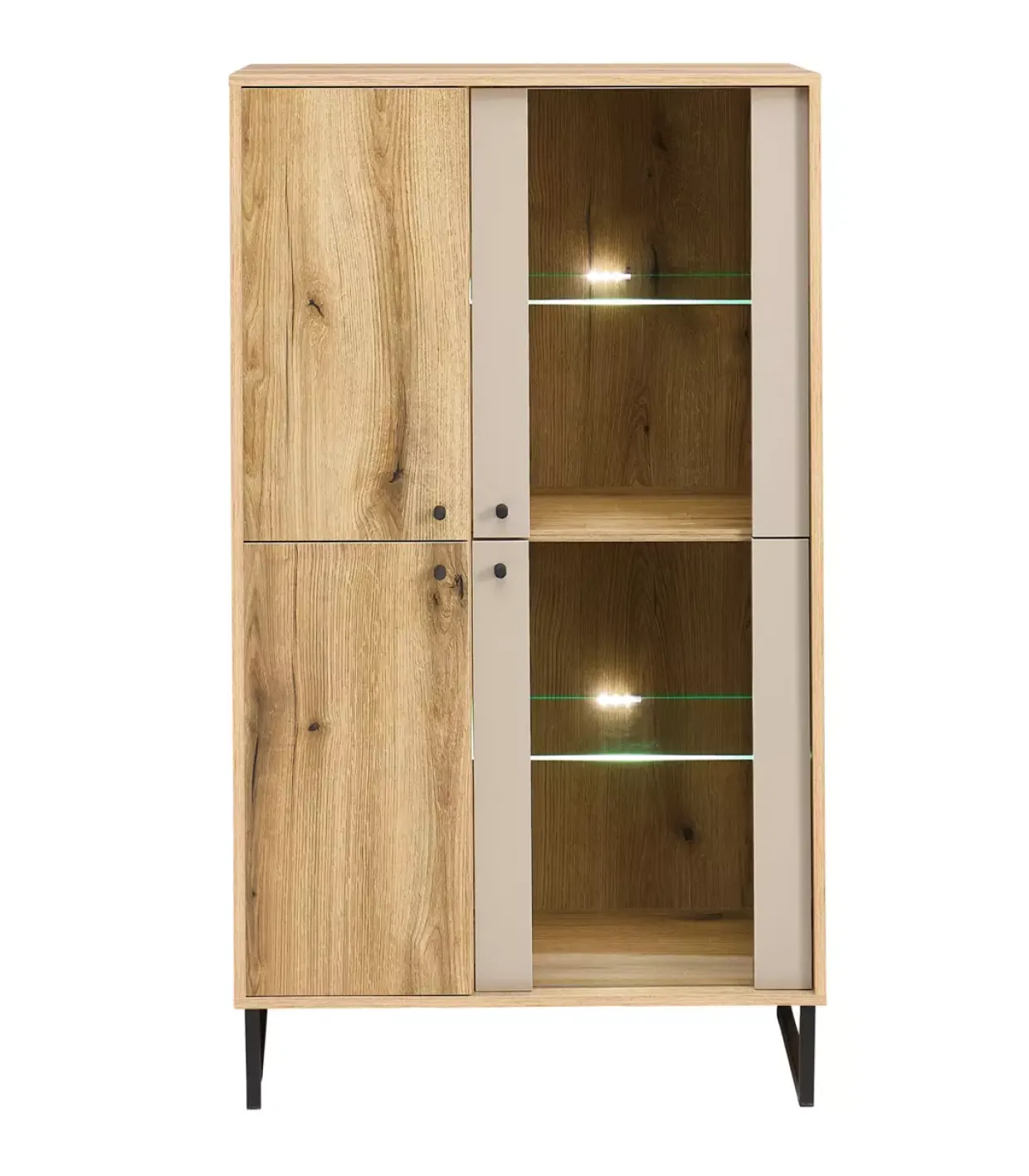 Eiche und Sandgrau harmonieren in der modernen Vitrine auf beeindruckende Weise. Diese halbhohe Vitrine vereint zeitgenössisches Design mit funktionaler Eleganz. Glasflächen bieten nicht nur Schutz für wertvolle Stücke, sondern setzen diese auch gekonnt in Szene. Ein geradliniges Design, das sich ideal in ein modernes Interieur einfügt, wird durch eine gelungene Materialkombination abgerundet.