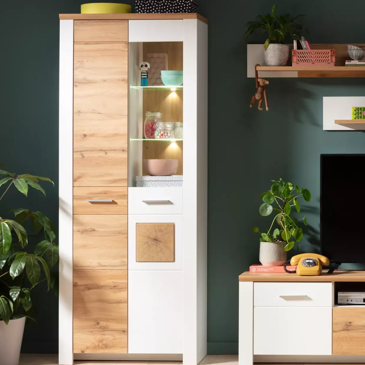 Die Drehtüren des Schranks sind mit einem Soft-Close-System ausgestattet, das sanftes und geräuschloses Schließen ermöglicht. Die Gleiterfüße sorgen für einen stabilen Stand und fügen sich harmonisch in das Gesamtbild ein. Ein weiteres Highlight ist die integrierte LED-Beleuchtung, die Ihre wertvollen Sammlerstücke oder Erinnerungsstücke in Szene setzt und für eine stimmungsvolle Atmosphäre sorgt.