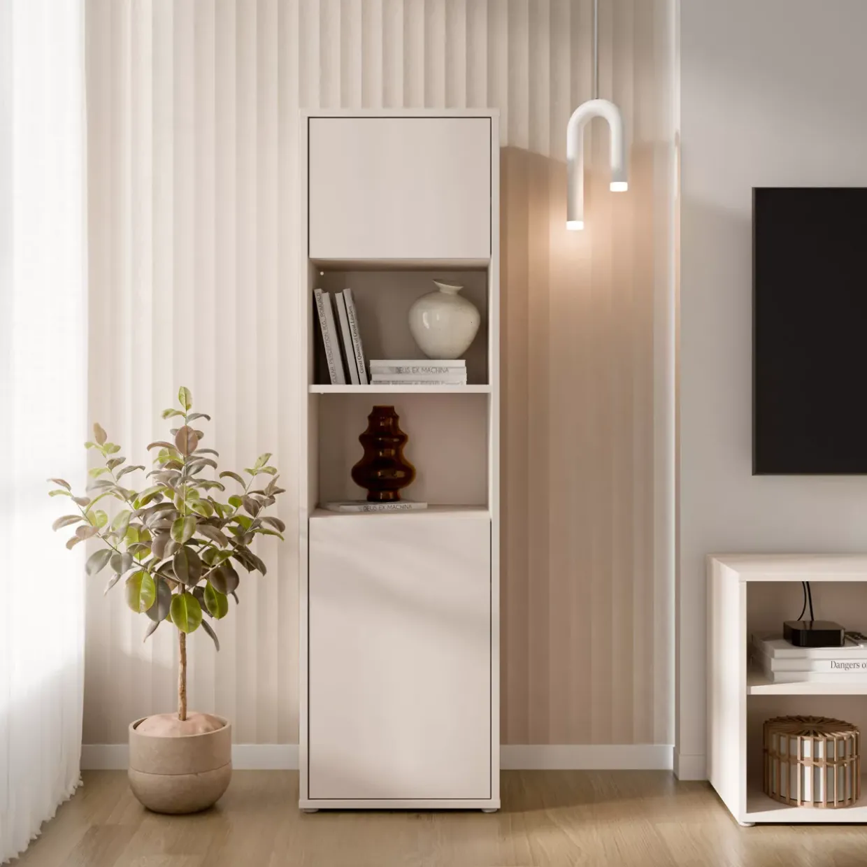 Die moderne Ästhetik dieser Vitrine zieht sofort alle Blicke auf sich. In einer edlen U Sand Nachbildung gefertigt, fügt sie sich harmonisch in zeitgenössische Einrichtungen ein. Aus robustem Holzwerkstoff hergestellt, bietet sie nicht nur optische Eleganz, sondern auch Stabilität und Langlebigkeit.Zwei Exemplare dieser Vitrine stehen Ihnen zur Verfügung, um Ihre Lieblingsstücke stilvoll zu präsentieren. Die klare Linienführung und das durchdachte Design unterstreichen die moderne Anmutung, während die neutrale Farbgebung vielseitig kombinierbar ist. Ein besonderes Highlight ist die innovative Push-To-Open-Funktion. Diese ermöglicht ein müheloses Öffnen der Türen, ohne den Einsatz von Griffen. So bleibt das puristische Design ungestört und bietet zugleich hohen Bedienkomfort. Diese Funktion ist nicht nur praktisch, sondern verleiht der Vitrine auch eine moderne Raffinesse.Die Vitrine eignet sich perfekt, um Ihre wertvollen Objekte in Szene zu setzen. Ob im Wohnzimmer, Esszimmer oder Büro – sie fügt sich nahtlos in verschiedene Wohnkonzepte ein und hebt die Schönheit Ihrer Dekorationsstücke hervor. Erleben Sie, wie Funktionalität und Ästhetik in diesem Möbelstück auf elegante Weise verschmelzen und Ihrem Raum eine individuelle Note verleihen.