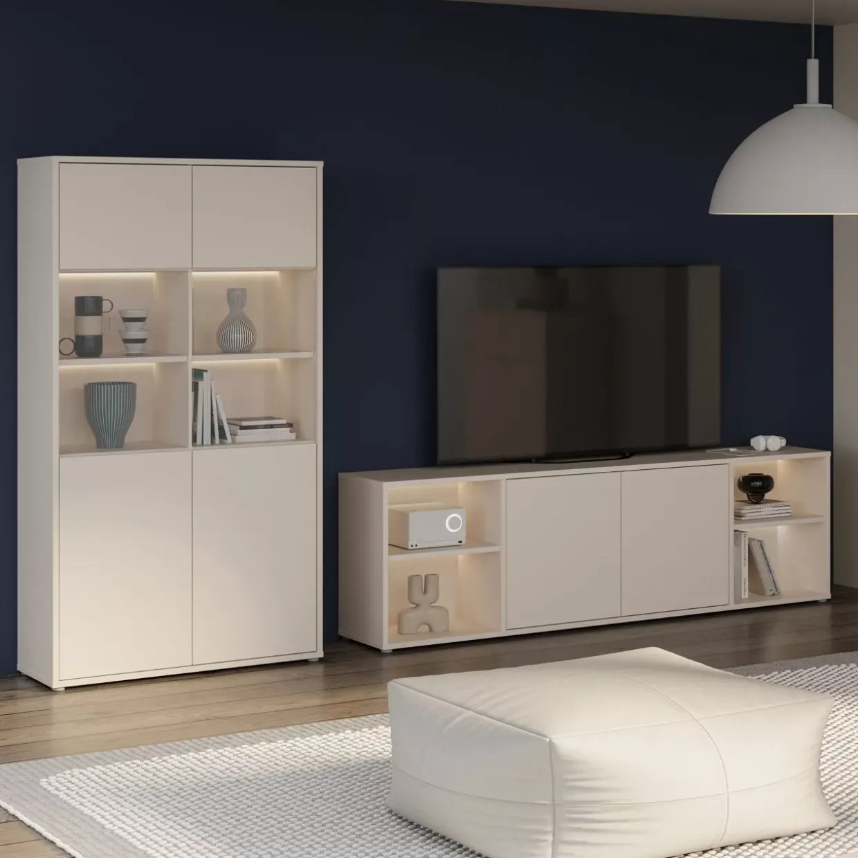 Die elegante U Sand Nachbildung verleiht dieser modernen Vitrine einen warmen, einladenden Charakter. Mit ihrem zeitgemäßen Stil fügt sie sich nahtlos in verschiedene Wohnkonzepte ein und setzt stilvolle Akzente in Ihrem Zuhause. Hergestellt aus hochwertigem Holzwerkstoff, bietet sie eine langlebige und stabile Konstruktion, die den täglichen Anforderungen problemlos standhält.Ein besonderes Highlight dieser Vitrine ist die innovative Push-To-Open-Funktion. Genießen Sie den Komfort, die Türen mühelos und ohne sichtbare Griffe zu öffnen, was für eine klare Optik und ein minimalistisches Design sorgt. Diese Funktion unterstreicht nicht nur die moderne Ästhetik, sondern bietet auch praktische Vorteile im täglichen Gebrauch.Mit einer Anzahl von vier Stück eignet sich diese Vitrine ideal, um Ihre Lieblingsstücke stilvoll zu präsentieren oder zusätzlichen Stauraum zu schaffen. Ob im Wohnzimmer, im Essbereich oder im Büro – die Vitrine bietet vielseitige Nutzungsmöglichkeiten und setzt Ihre Sammlerstücke, Bücher oder Dekorationen gekonnt in Szene.Entdecken Sie die Kombination aus Funktionalität und Design, die diese Vitrine auszeichnet. Sie schafft eine harmonische Balance zwischen Ästhetik und praktischer Anwendung und wird so zu einem unverzichtbaren Bestandteil Ihrer Einrichtung.