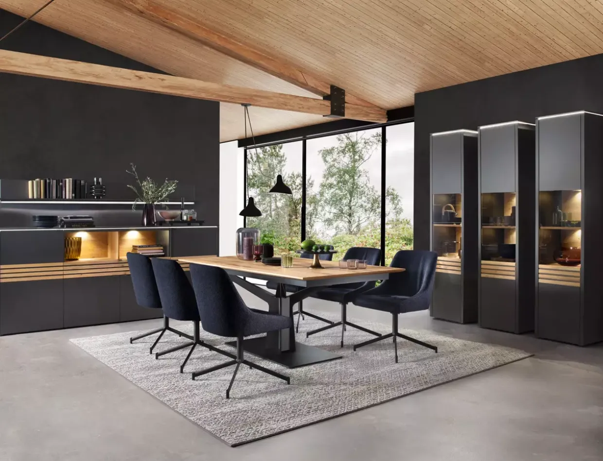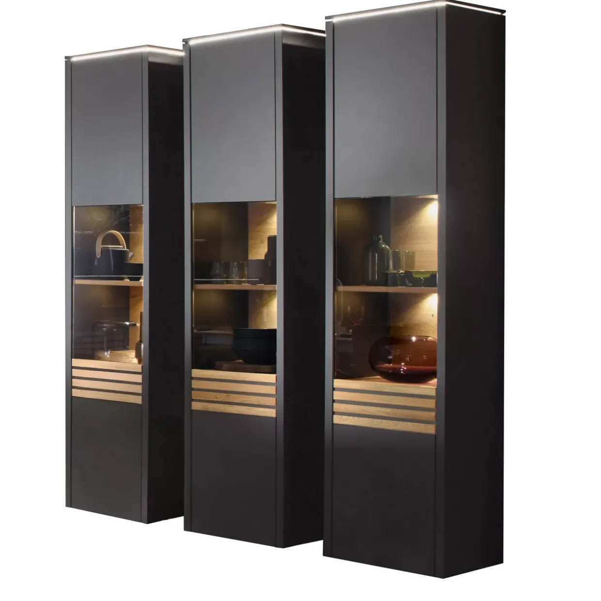 Akzentuiert durch eine gerade Lamelle, präsentiert sich die moderne Vitrinenkombination als stilvoller Blickfang für Ihr Zuhause. Die Kombination aus Glas, Holz und Metall sorgt nicht nur für Stabilität, sondern auch für einen harmonischen Materialmix, der sich nahtlos in jede moderne Einrichtung einfügt. Die Lackierung in Anthrazit matt verleiht dem Möbelstück eine zeitlose Eleganz, während das klare Optiwhite-Glas für eine unverfälschte Sicht auf Ihre Lieblingsstücke sorgt.