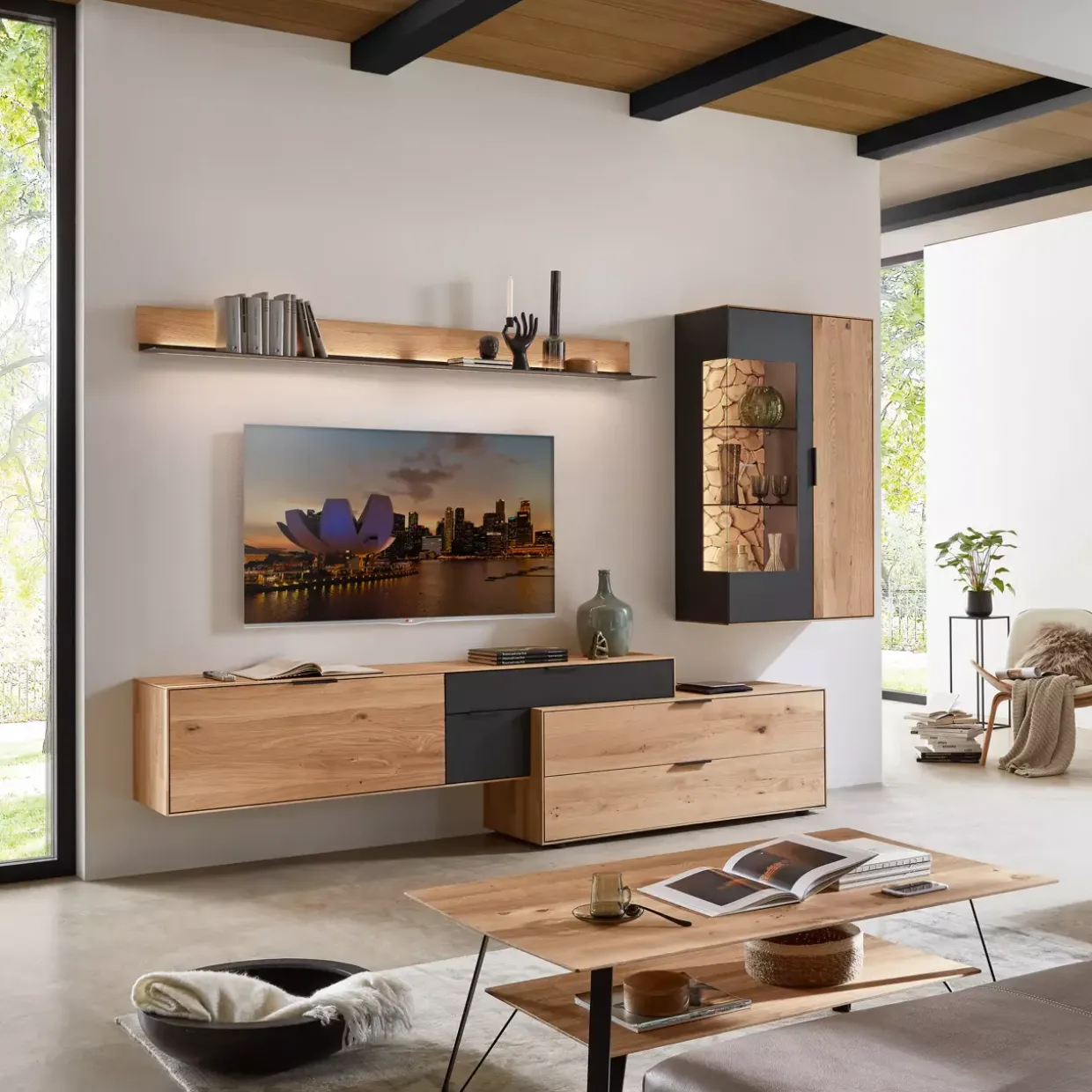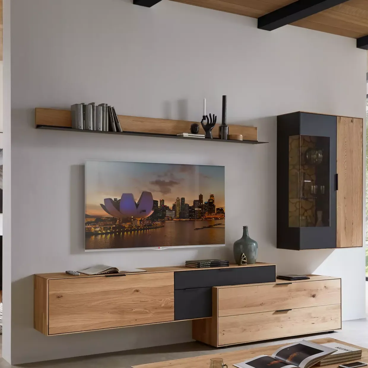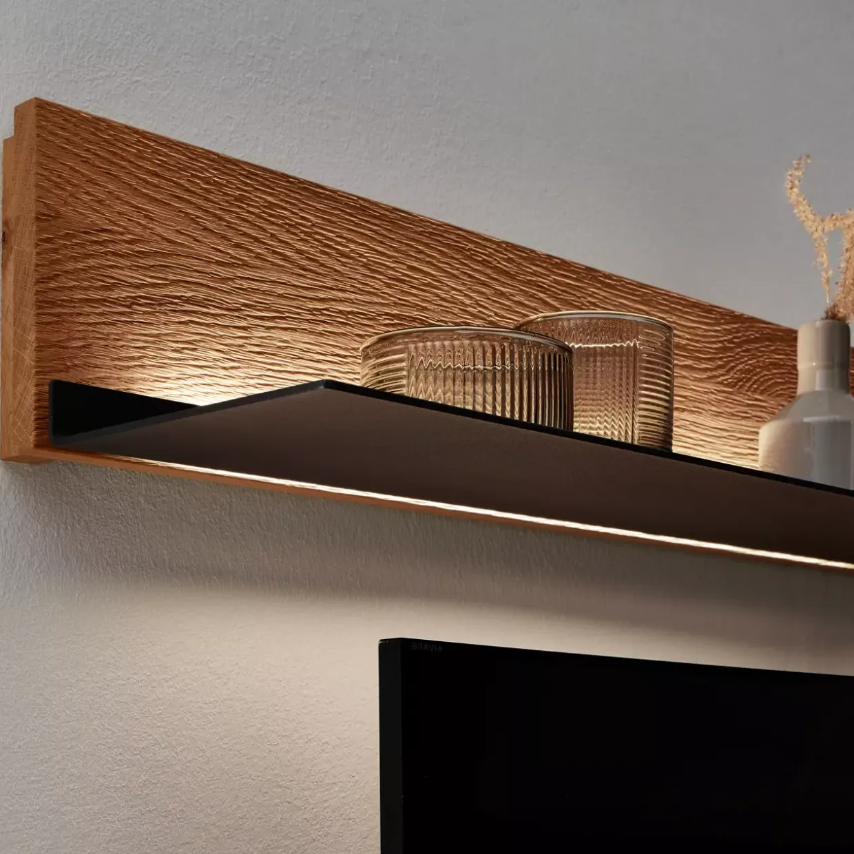Die Verbindung von Wildeiche massiv, soft gebürstet, und carbonfarbig strukturgepulvertem Metall macht das Varedo Wandbord zu einem modernen Highlight in jedem Raum. Ästhetisch ansprechend und funktional zugleich, bietet dieses stilvolle Möbelstück eine dauerhafte und pflegeleichte Natur-Effekt-Lackoberfläche. Die hochwertigen Metallkomponenten, die mit einer strapazierfähigen, strukturierten Pulverbeschichtung versehen sind, unterstreichen die Langlebigkeit und Robustheit des Designs.