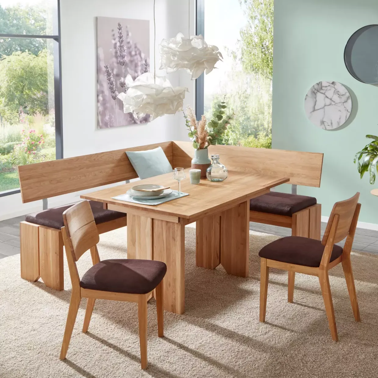 Stabilität und Eleganz vereinen sich in der ästhetischen Wangenfußform, die dem Tisch nicht nur Halt verleiht, sondern auch ein attraktives Designmerkmal darstellt. Die geölte Oberfläche unterstreicht die natürliche Holzmaserung und sorgt für eine angenehme Haptik.