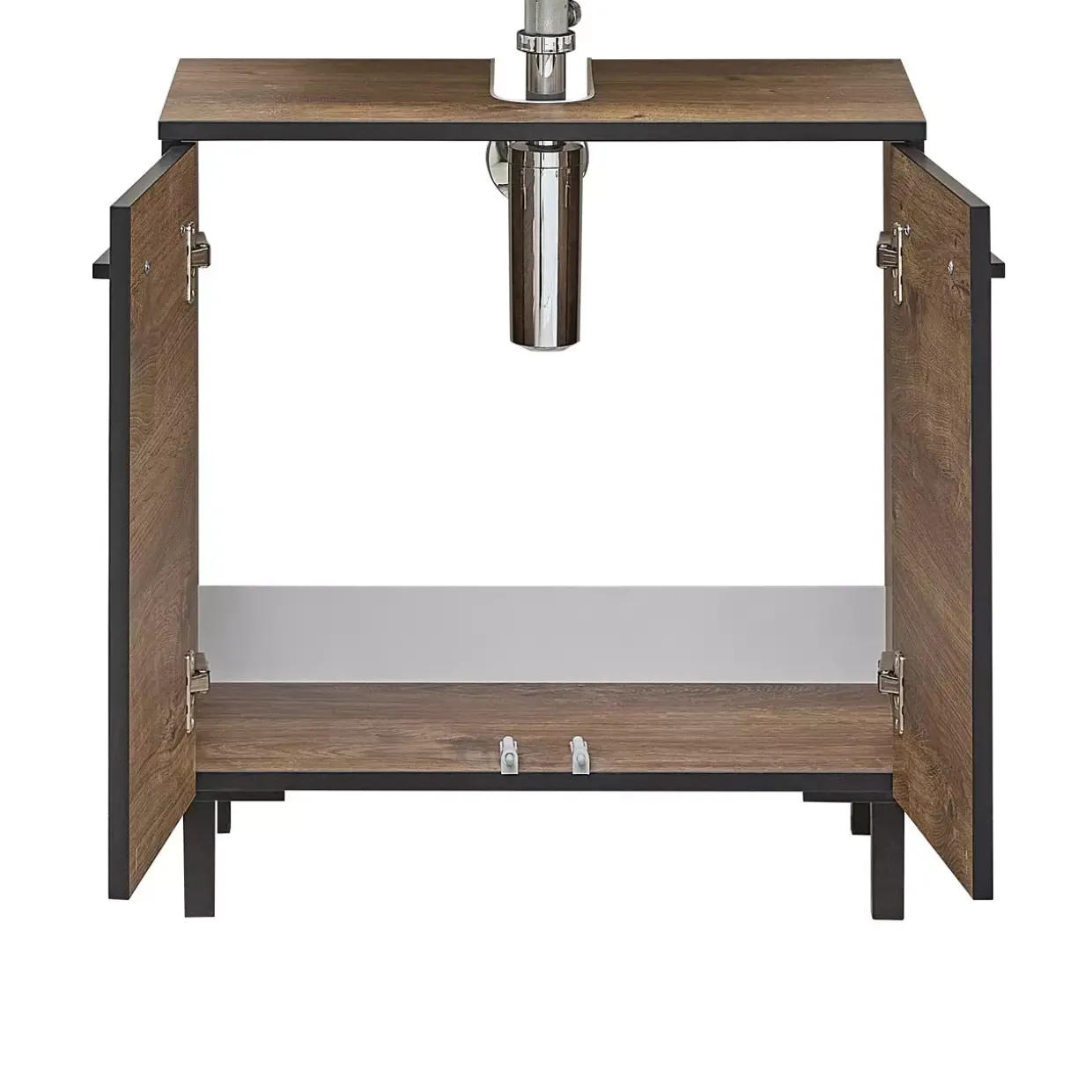 Ein besonderes Highlight sind die Drehtüren, die mit Türdämpfern ausgestattet sind, um das Schließen sanft und geräuscharm zu gestalten. Der integrierte Siphonausschnitt erleichtert die Installation unter dem Waschbecken, ohne dass zusätzliche Anpassungen nötig sind.