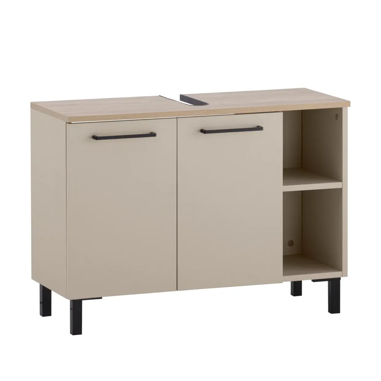 Erleben Sie die moderne Eleganz eines Waschbeckenunterschranks, der durch seine stilvolle Kombination aus Holzwerkstoff und Metall besticht. Die harmonische Farbgebung in Creme beige und schwarz matt ergänzt sich perfekt mit der natürlichen Ausstrahlung der Eichenabdeckplatte. Ein formschönes 4-Fußgestell verleiht dem Möbelstück Stabilität und eine klare Linienführung.